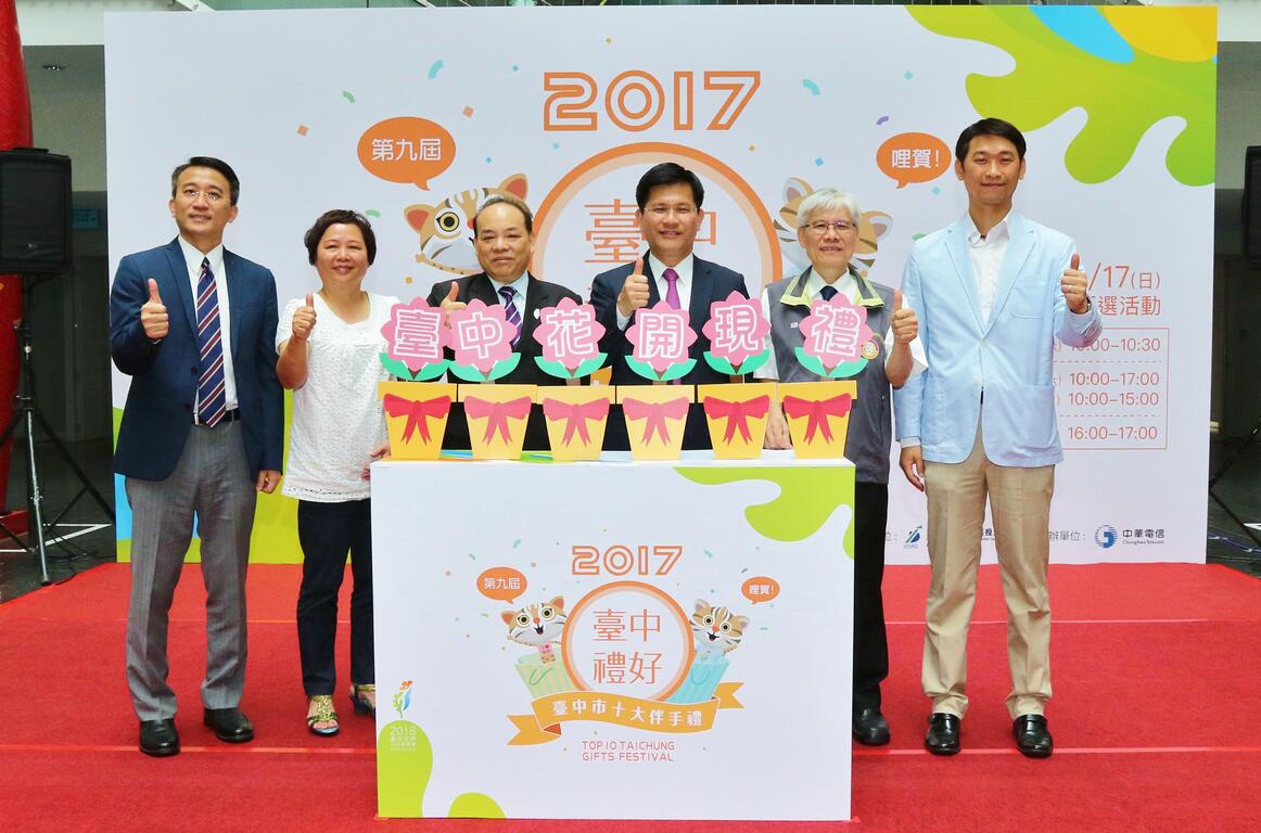 2017台中十大伴手禮票選開鑼!今年台中十大伴手禮共吸引156家廠商報名,經歷初選共有100家參加「全民票選」,16、17日兩天在台中公園,邀請全民共同選出最具台中代表性的禮品。市長林佳龍今(12)日在活動宣傳記者會上表示,伴手禮展現台中味,也是「台中WAY」的待客之道,邀民眾共同參與票選,認識台中伴手禮,並多選購伴手禮行銷大台中。