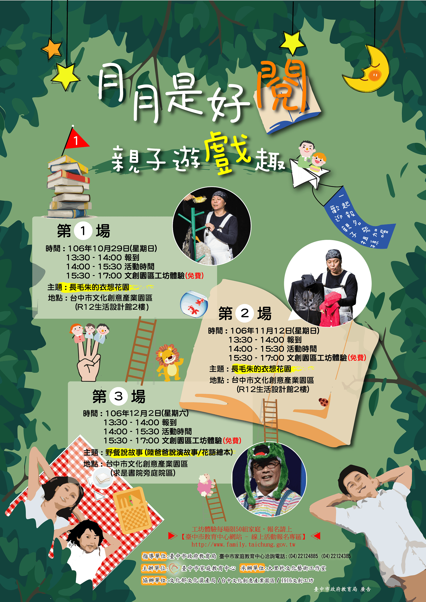 活動有三場次,內容包含說故事、戲劇表演及工坊體驗,場次活動時間及主題說明如下: