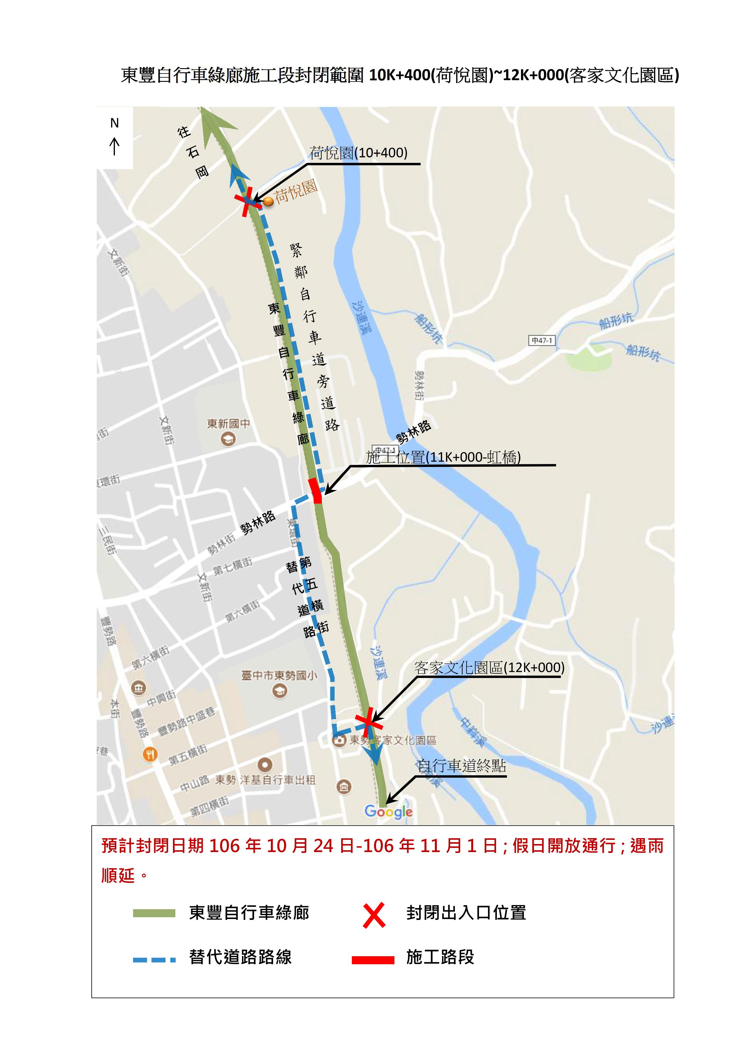 觀旅局表示,鋼構橋梁維護工作將從上午9時至下午4時,預計封閉路段及日期如下:東豐自行車綠廊荷悅園(10K+400)至東勢文化園區(12K),自10月24日起至11月1日日止;潭雅神綠園道社南站休憩點(3K+500)至中山路667巷口(4K+400),自10月27日起至11月10日止;潭雅神綠園道天會宮(1K+700)至三和路口(2K+250)及潭雅神綠園道中山路989巷口(5K+100)至義民廟(5K+500),自11月6日起至106年11月10日止。