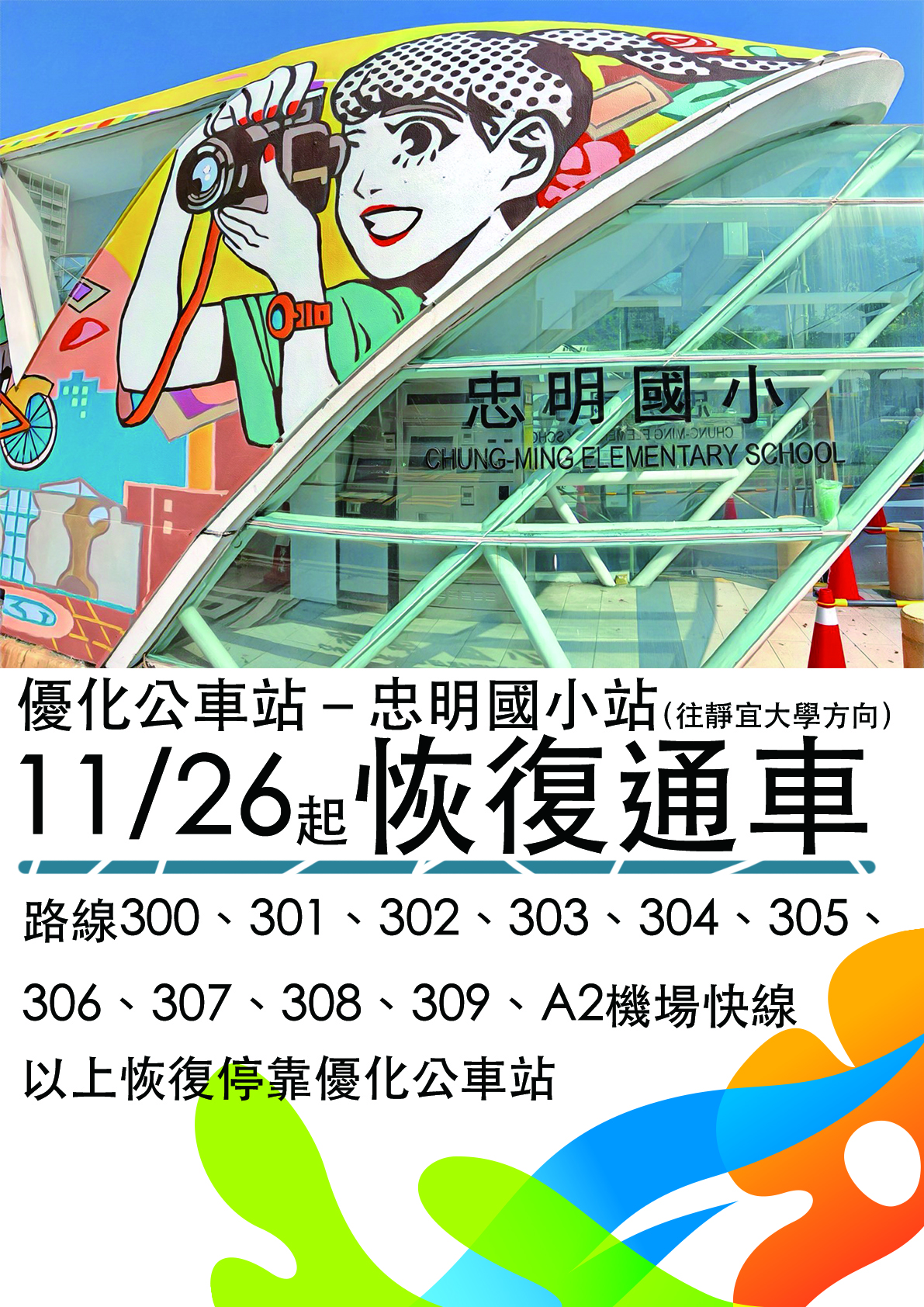 由於考量公共安全,原預計11月10至30日彩繪作業期間,封閉優化公車站-忠明國小站(往靜宜大學),原行駛公車專用道公車301、302、303、304、305、306、307、308、A2調整至慢車道忠明國小站上下客;300、309路屬雙節公車,因該路段慢車道狹窄,不行駛停靠慢車道站位,直接行駛下一站頂何厝站停靠,而整體工程預計提前於11月25日完工,相關交通措施將於11月26日恢復正常。