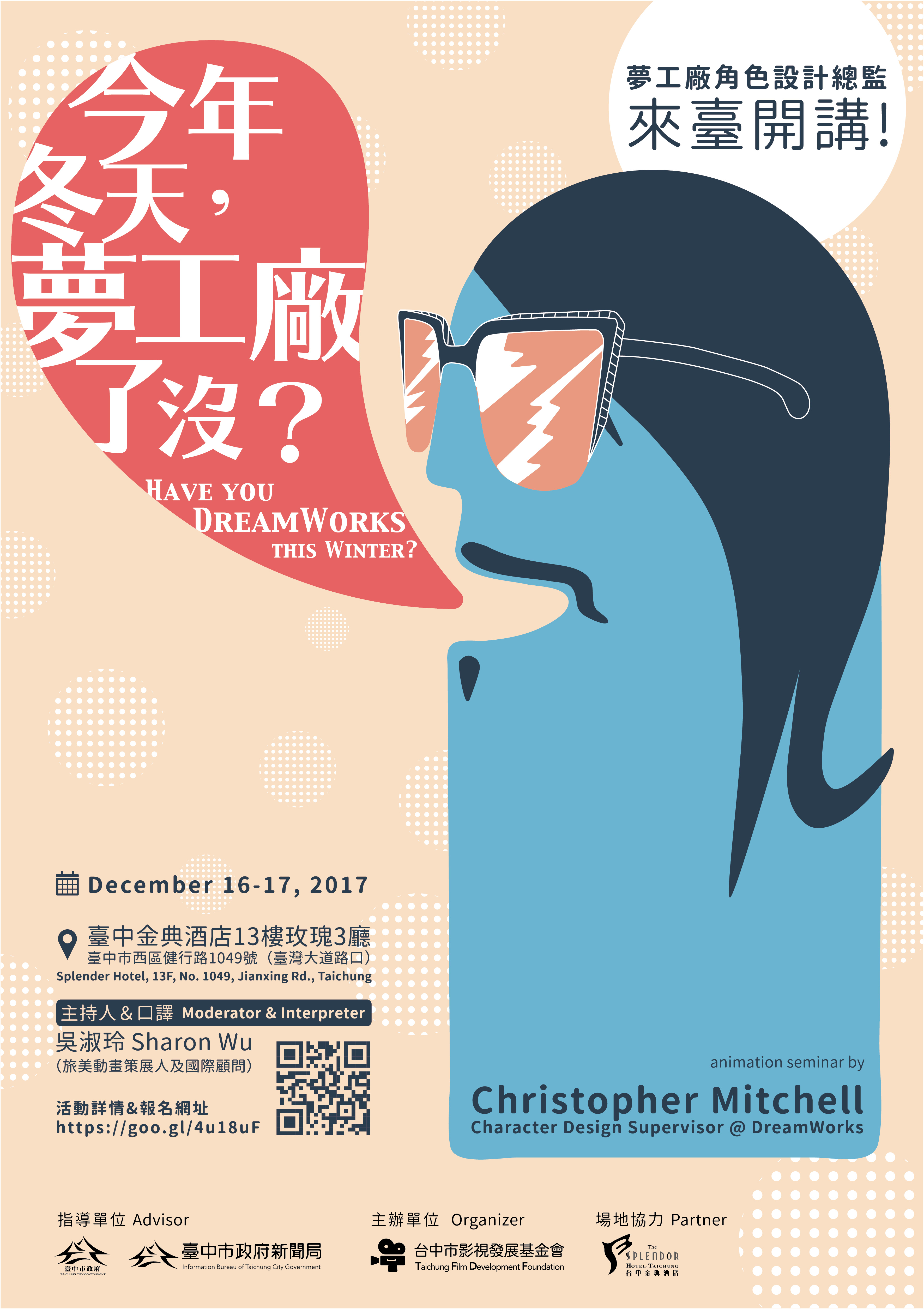 新聞局表示,這次活動全程以英文進行,並由旅美動畫策展人暨國際顧問吳淑玲提供中文逐步口譯。活動全程免費,報名即日起至12月8日止,名額有限,報名需收到「錄取通知」才算報名成功。活動詳情可至報名網站查詢。