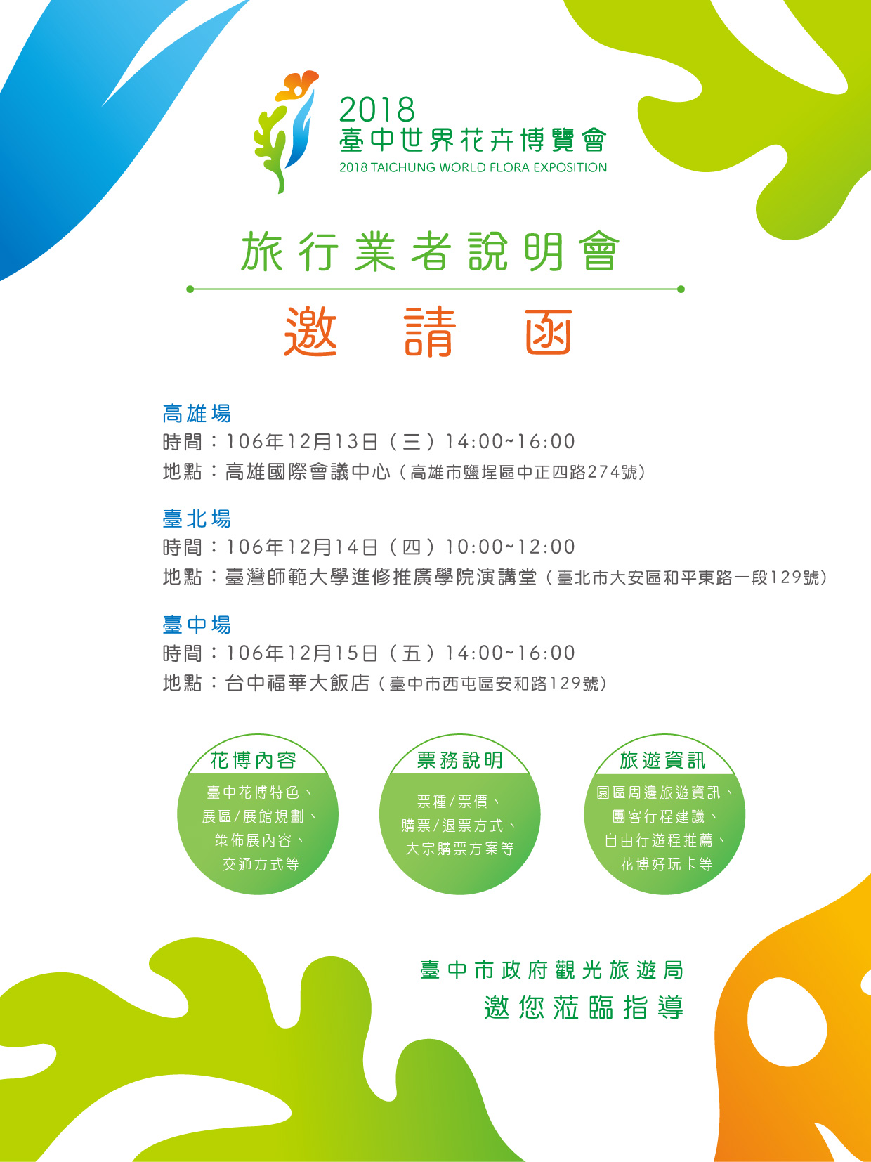 2018臺中世界花卉博覽會即將於明年11月舉辦,誠心邀請全臺各旅遊相關業者共同行銷花博,臺中市政府觀光旅遊局訂於【106年12月13日於高雄國際會議中心】、【106年12月14日於臺灣師範大學進修推廣學院】及【106年12月15日於台中福華大飯店】分別舉辦三場臺中花博業者說明會,敬邀同業踴躍報名參加,期盼廣大業者一同共創商機!