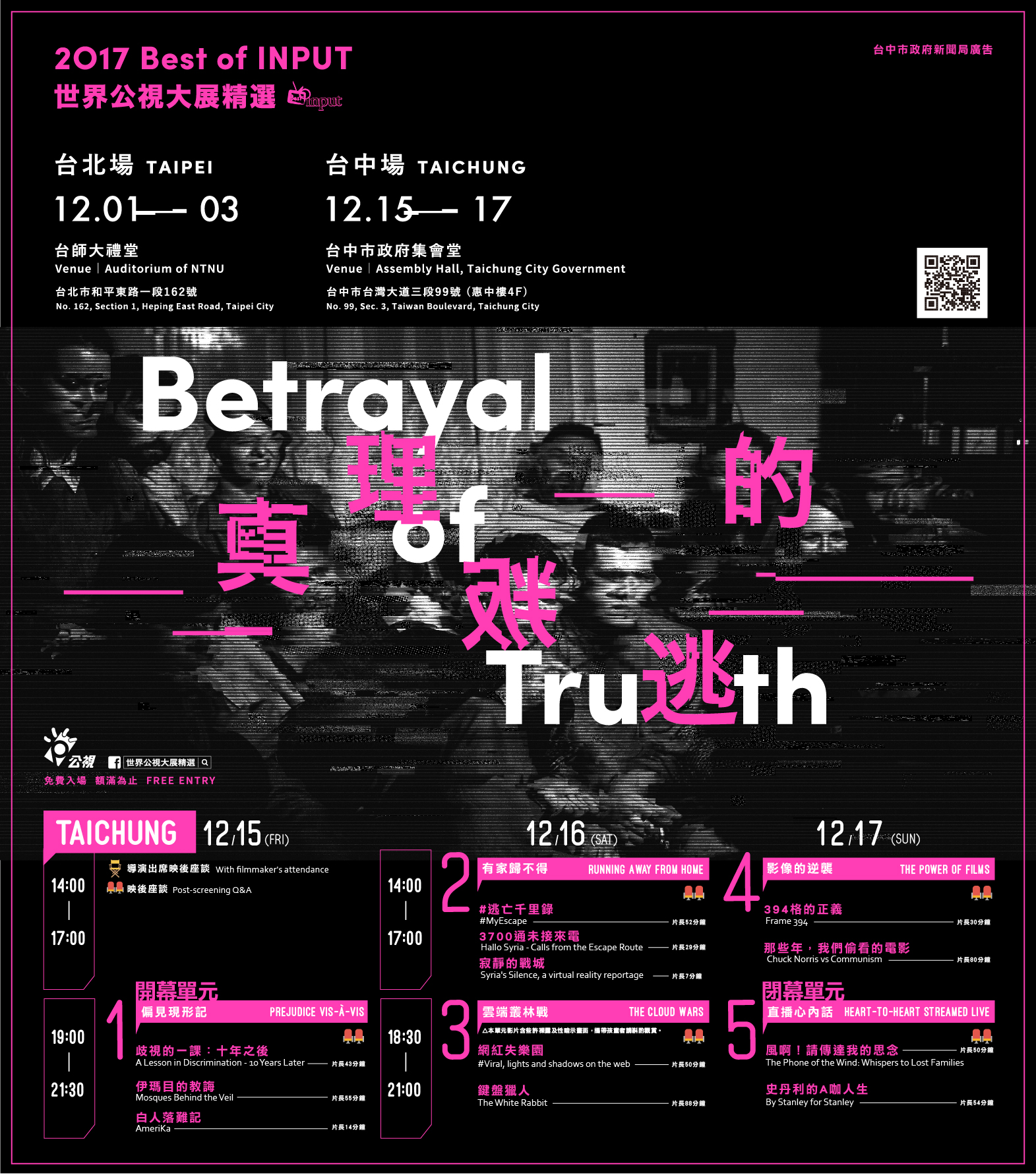 「世界公視大展精選─真理的叛逃」影展將自15日至17日在台中市政府集會堂(台灣大道市政大樓四樓)舉行,免費索票及更多資訊請上影展官網,或「世界公視大展精選」臉書專頁 查詢