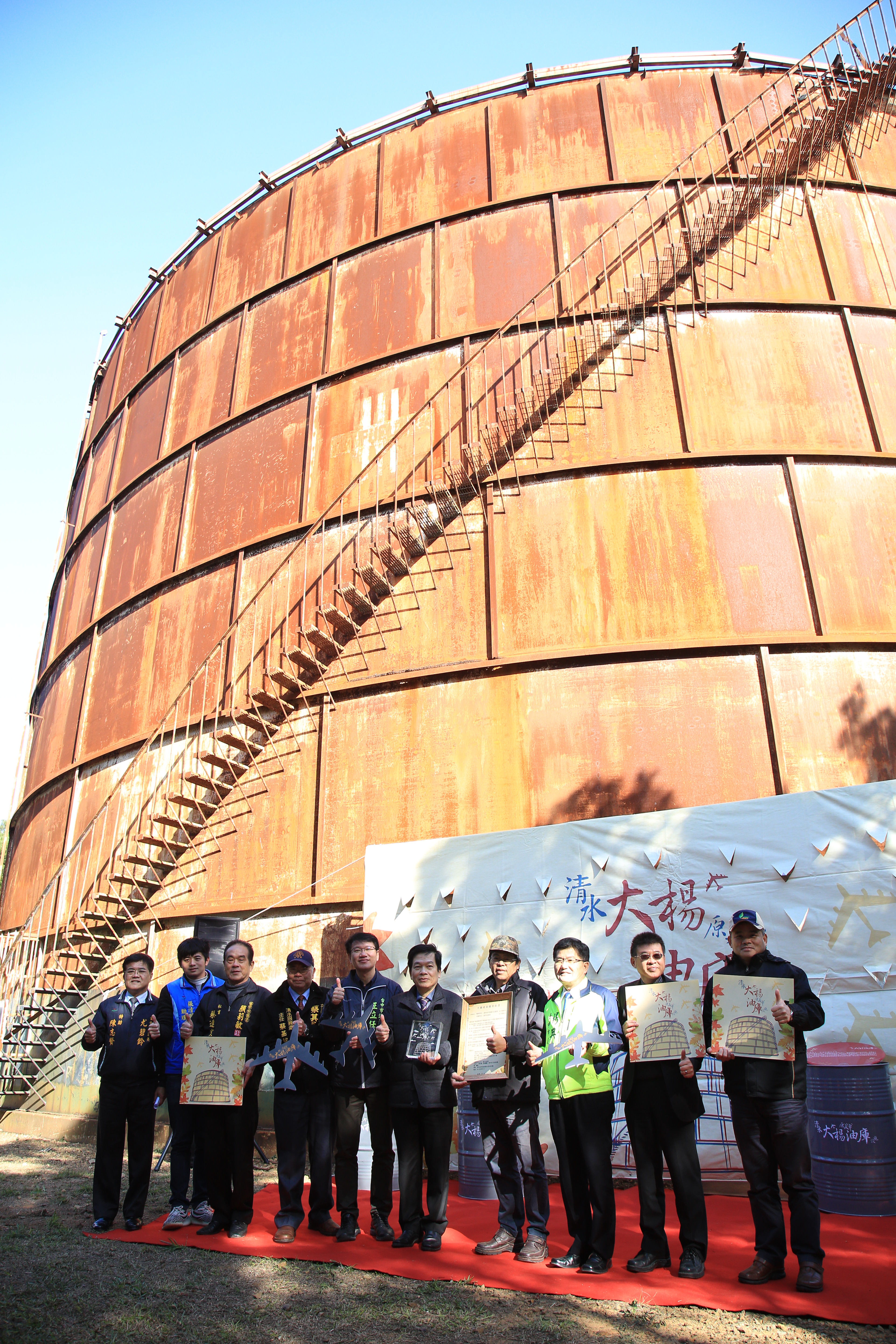 今(12)日清水大楊油庫捐贈儀式,由牛罵頭文化協進會及六百名地方居民捐贈,台中市政府秘書長黃景茂代表市府受贈,文化局副局長黃名亨、市議員王立任、楊典忠、清水區長張明昌等人都到場觀禮。