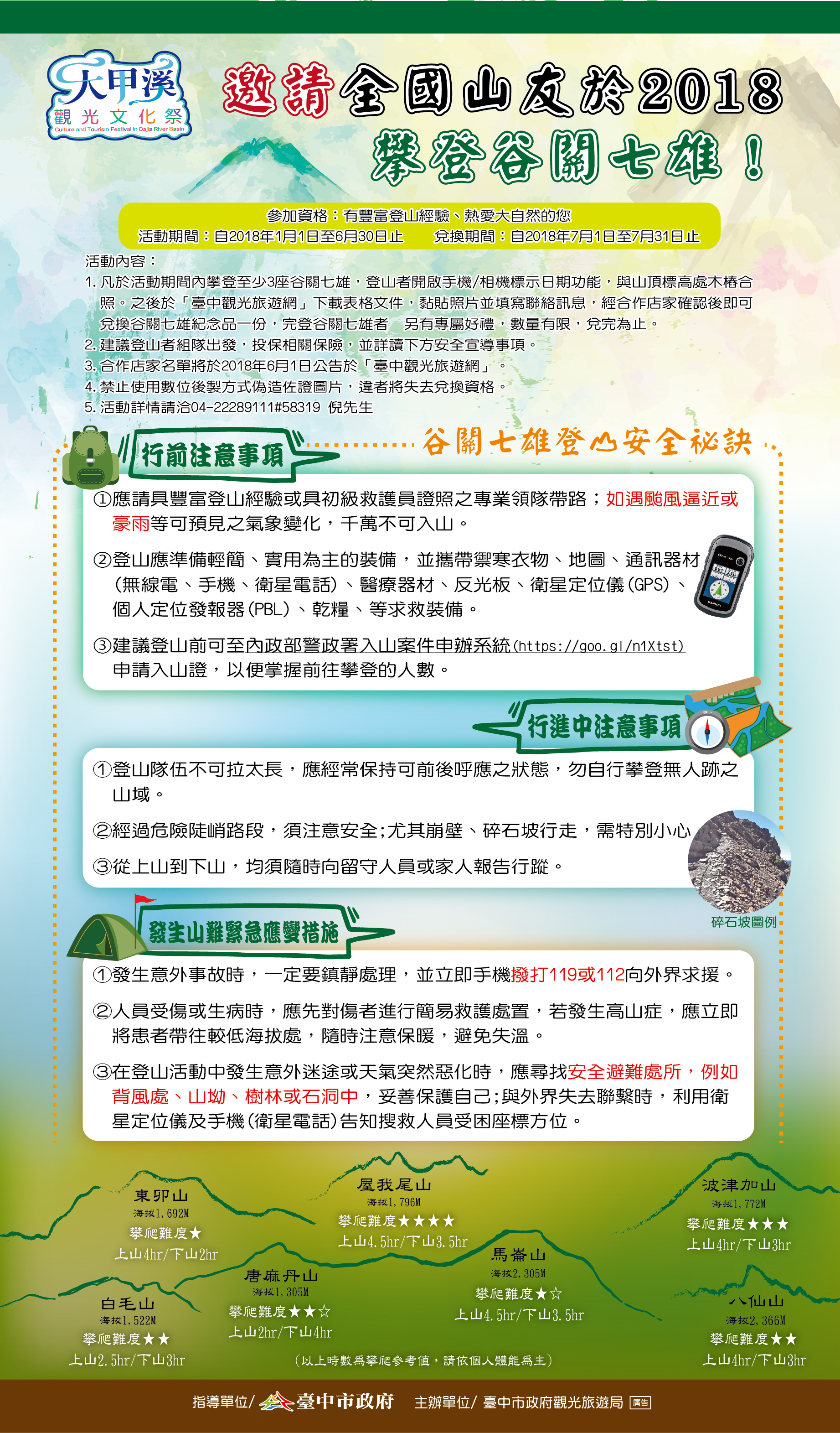 - 凡於活動期間內攀登至少3座谷關七雄,登山者開啟手機/相機標示日期功能,與山頂標高處木樁合照。之後於「臺中觀光旅遊網」下載表格文件,黏貼照片並填寫聯絡訊息,經合作店家確認後即可兌換谷關七雄紀念品一份,完登谷關七雄者另有專屬好禮,數量有限,兌完為止。