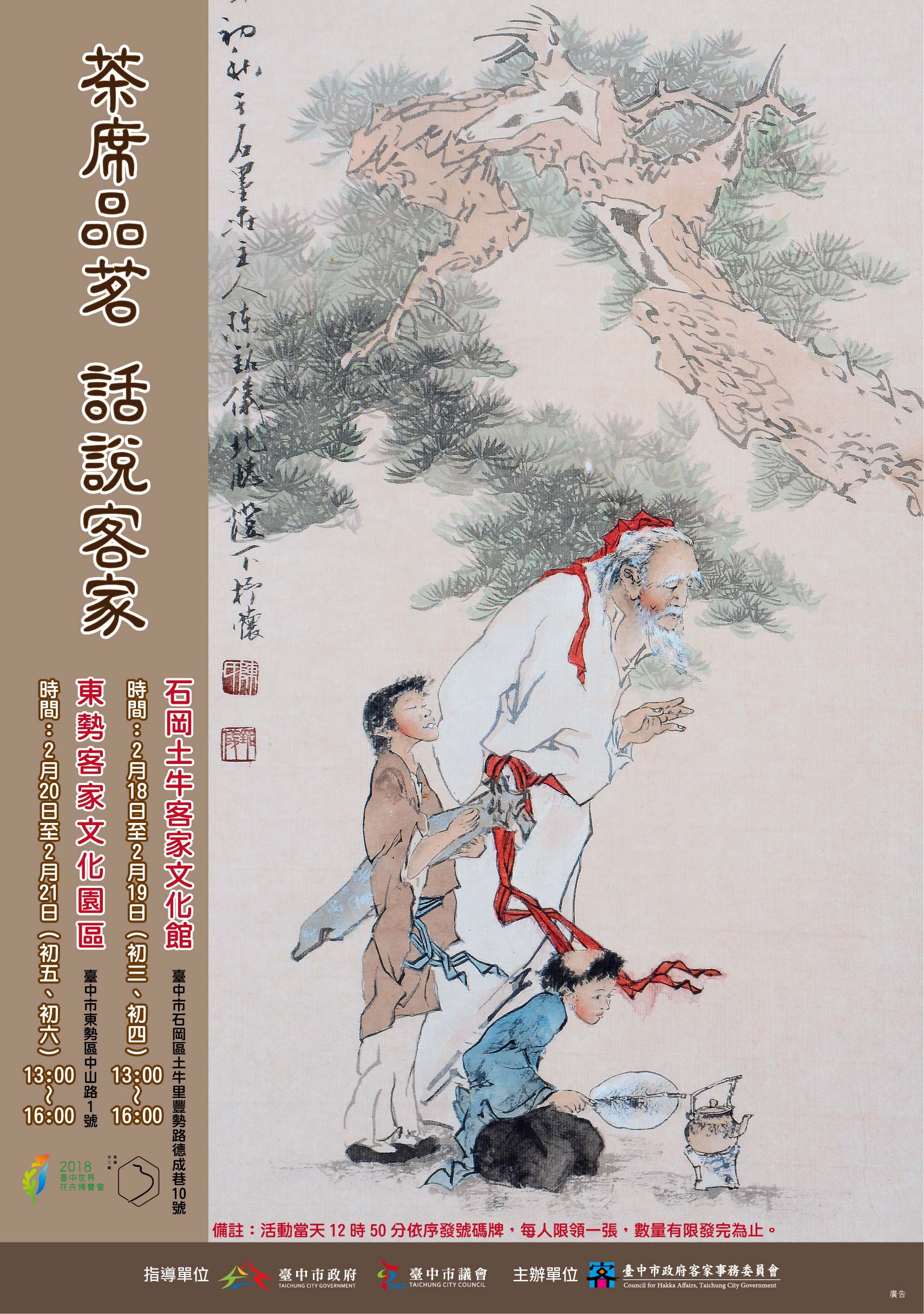 中市府客委會分別於2月18、19日(初三、初四) 在石岡土牛客家文化館及2月20、21日(初五、初六) 在東勢客家文化園區,舉行「茶席品茗-茶語花香敍客情」,活動訂於13時-16時,茶師將以不同主題布置,配合音樂演出,在圍繞櫻花、桂花園區內,欣賞客家建築之美,在悠揚意境中細細品味茶香,是兼具視覺、聽覺、味覺的三重享受,更是年節走春好去處。