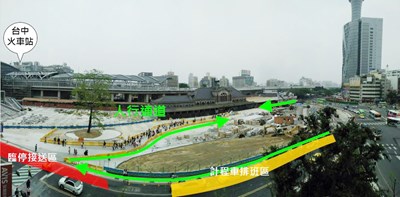 王局長進一步說明,最後一階段施工範圍涵蓋現有計程車排班區及臨停接送區,施工圍籬架設後,外側雙向皆留有3線車道供車輛通行,此外,該局配合施工將臨停及計程車排班區動線調整,無論從左側人行通道或是右側人行通道的民眾,通道外側皆有規劃計程車排班區或是公車及臨停接送區,讓民眾在轉乘上,不必穿越車流,能更安全、快速地進入台中火車站。