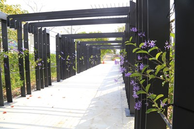花廊道不只白天美麗,在夜晚時分,也會透過燈光映照半包覆式的花廊道,讓紫色系為主的多元植栽及攀爬植物,在沿著包覆式花架廊道延伸,非常繽紛浪漫,讓漫步其中的遊客,都能感受百花為大家的祝福。