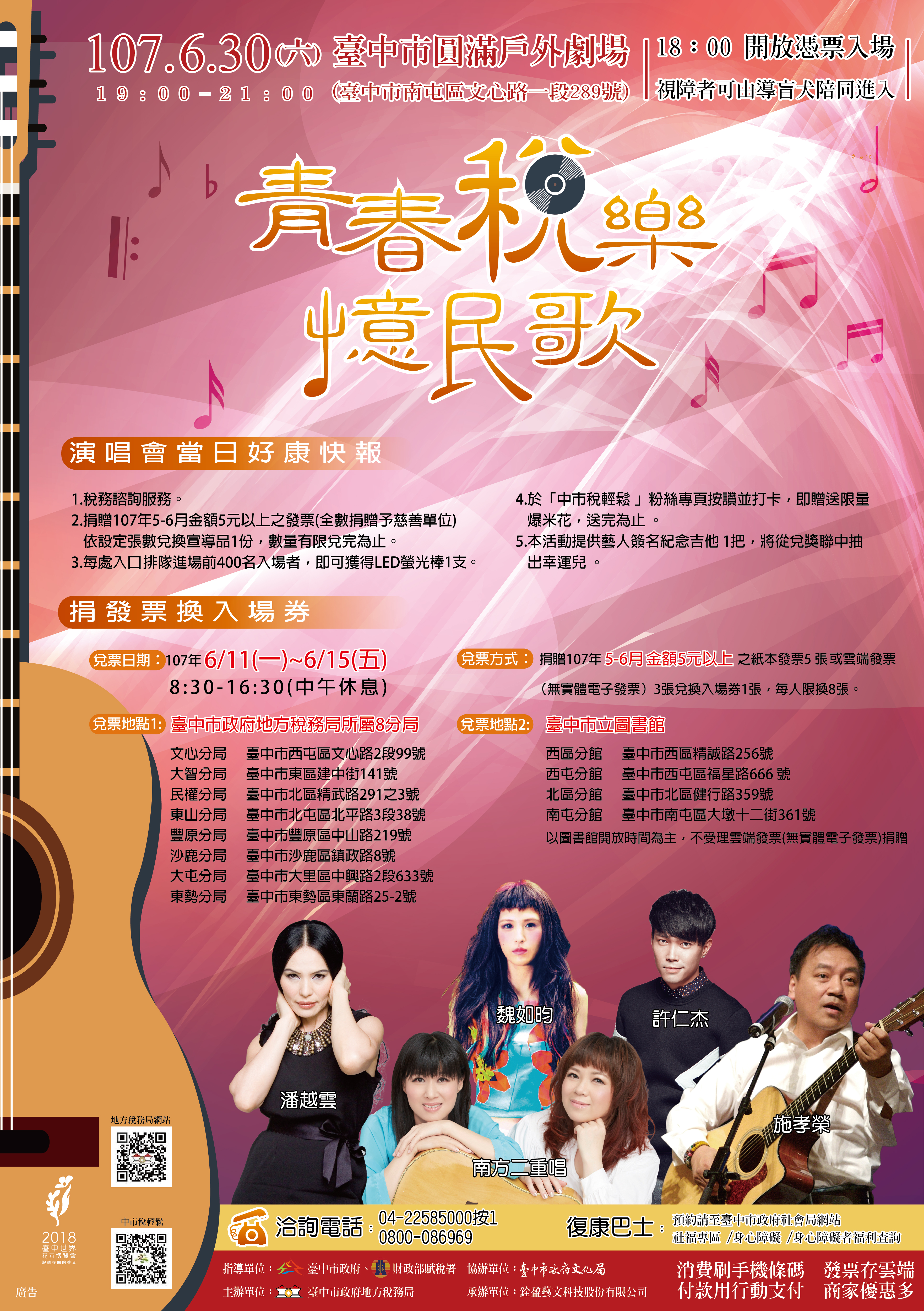 為感謝市民對稅政支持及為將到來的花博暖身,台中市政府將於6月30日舉辦「青春稅樂 憶民歌」演唱會,邀請施孝榮、南方二重唱、潘越雲、許仁杰與魏如昀等知名歌手,在圓滿戶外劇場演出,6月11日至15日期間,民眾可至稅務局所屬文心、民權、東山、大智、大屯、豐原、東勢、沙鹿等8個分局,及市立圖書館西區、北區、西屯及南屯分館,捐贈5-6月金額5元以上的紙本發票5張或3張雲端發票,即可兌換入場券1張,每人至多兌換8張。