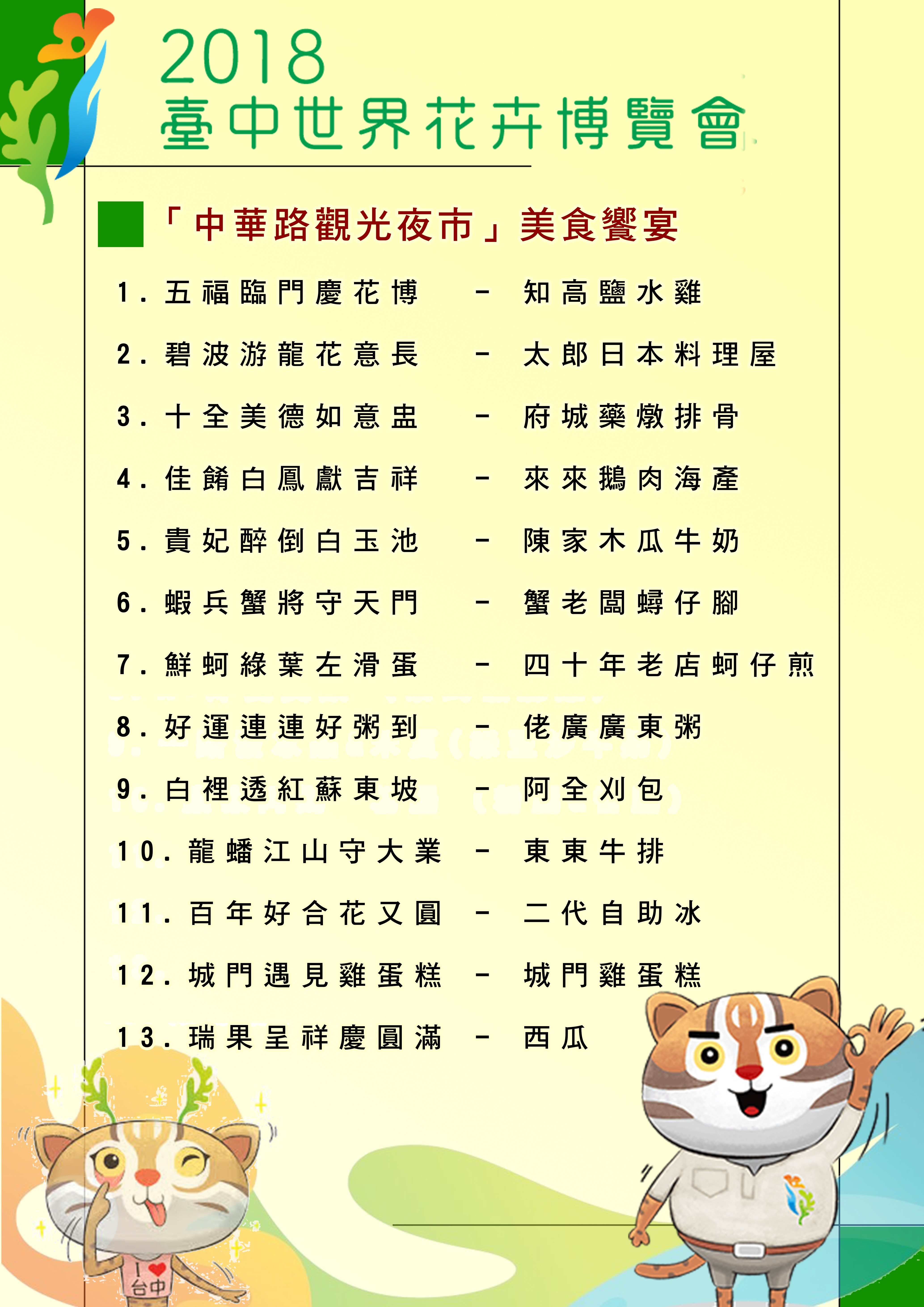 內容包括五福臨門慶花博(知高鹽水雞)、碧波游龍花意長(太郎日本料理屋)、十全美德如意盅(府城藥燉排骨)、佳餚白鳳獻吉祥(來來鵝肉海產)、貴妃醉倒白玉池(陳家木瓜牛奶)、蝦兵蟹將守天門(蟹老闆蟳仔腳)、鮮蚵綠葉左滑蛋(四十年老店蚵仔煎)、好運連連好粥到(佬廣廣東粥)、白裡透紅蘇東坡(阿全刈包)、龍蟠江山手大業(東東牛排)、百年好合花又圓(二代自助冰)、城門遇見雞蛋糕(城門雞蛋糕)、瑞果呈祥慶圓滿(西瓜水果盤)等13道菜色。