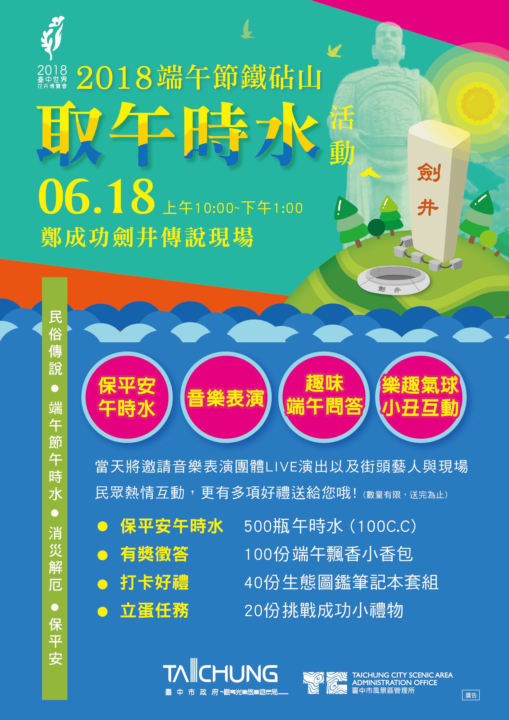 一年一度「2018端午節鐵砧山取午時水」將於18日上午10時將在劍井前廣場舉辦,安排有獎徵答,及午時立蛋小遊戲,為避免民眾搶水,台中市風景區管理所準備500份鐵砧山劍井紀念水瓶,並提醒民眾,活動之前為了清潔井體及辦理祈福儀式,劍井將封閉暫停使用,封井時間自今(15)日下午4時至18日上午11時。