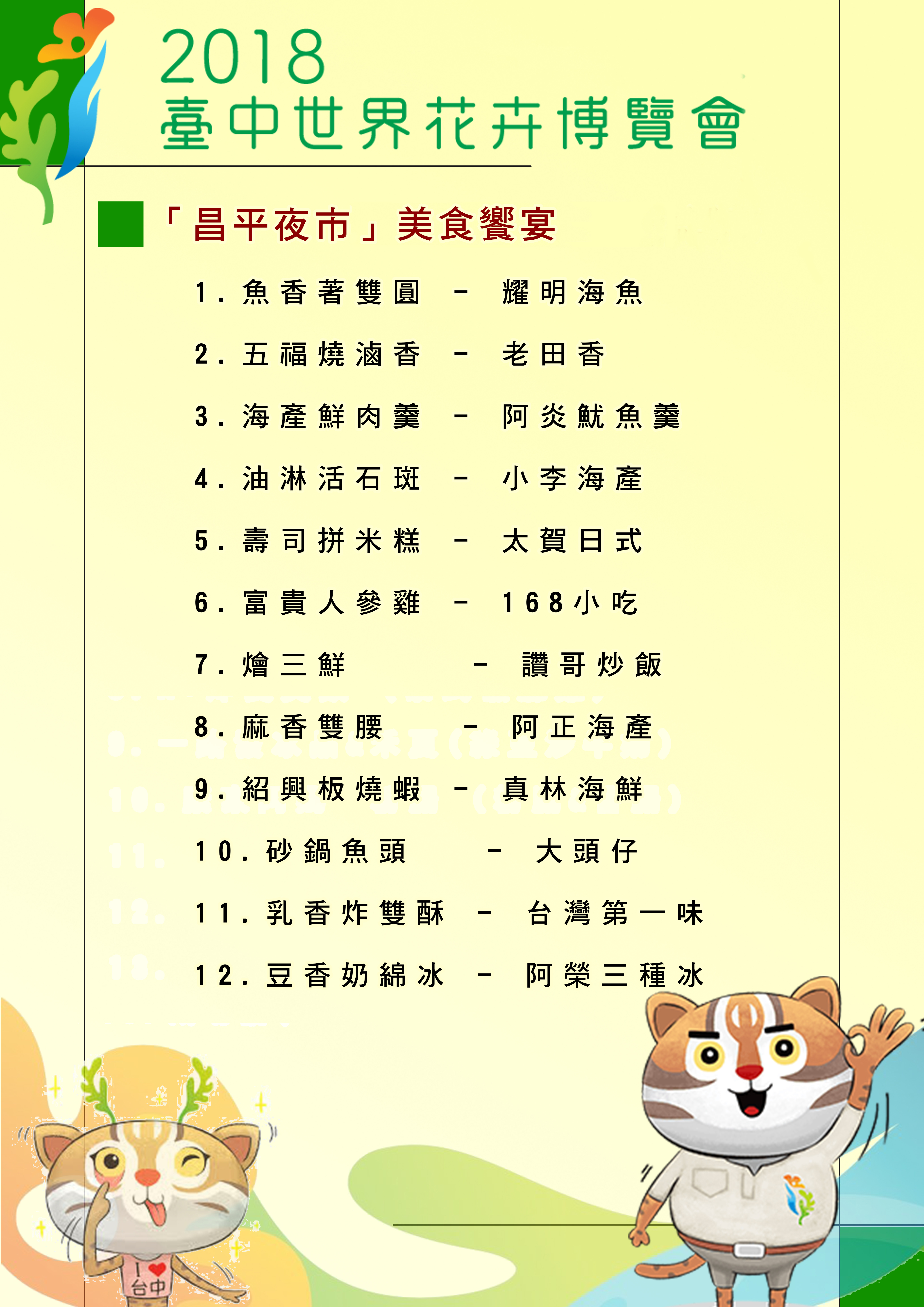 經發局表示,昌平夜市位於北屯區昌平路一段與北平路四段路口,106年榮獲經濟部核發2星優良市集,此次所推出的菜單「食」力堅強,包含知名店家耀明海魚、老田香滷味、阿炎魷魚羹、小李海產、太賀日及阿榮三種冰。