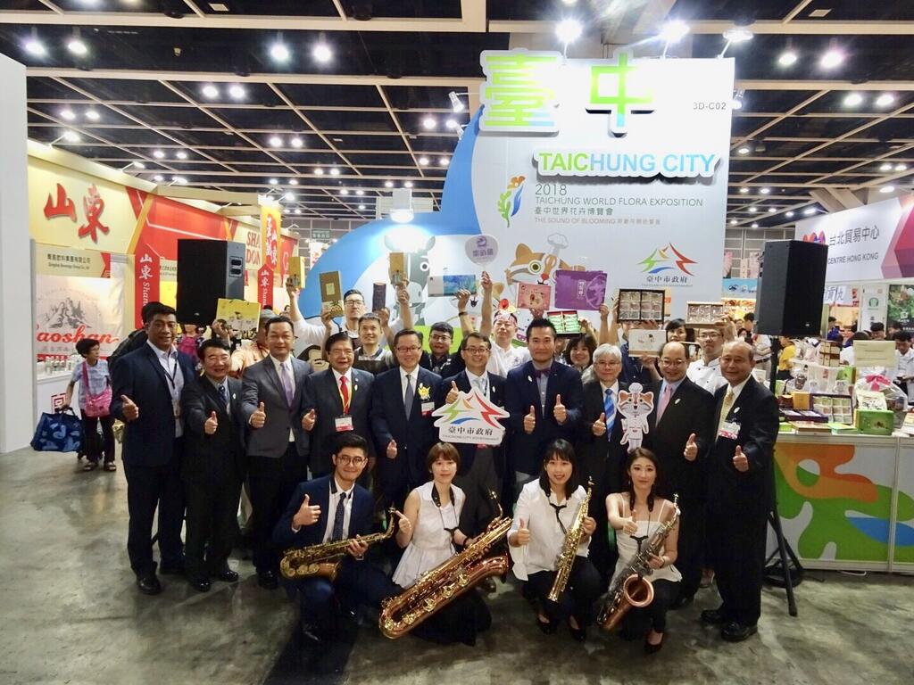 台中市政府經發局攜手台中10家食品業者赴香港參加「2018香港美食博覽會(Food Expo)」,以台中世界花卉博覽會為主題設計「台中形象館」,今(16)日開幕,現場提供免費台中糕點,還有台中特色產業薩克斯風的演奏,吸引參觀民眾目光。經發局長呂曜志表示,希望透過此次參展,協助在地食品業者拓展國際市場,也讓台中美食國際能見度進一步提升。
