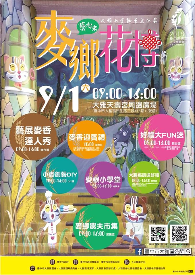 體驗麥鄉文化!大雅區公所將於9月1日在天壽宮前廣場舉辦「107年台中市大雅區小麥麵食文化節」,當日有大雅麥鄉農夫市集、文創市集,並安排美食品嘗、麥香達人舞台秀及麥根小學堂闖關遊戲等,邀您一同參與;2018台中市十大伴手禮票選,9月1至2日在台中公園登場,活動將從百大入圍店家商品中,評選出十大伴手禮獎、最佳人氣獎、金口碑獎、審團大獎、花博獎、優質清真獎及好禮標章等7大類獎項,現場還特別邀請歷年得獎店家「回娘家」,更有遊戲區要讓參與的大小朋友玩得開心!