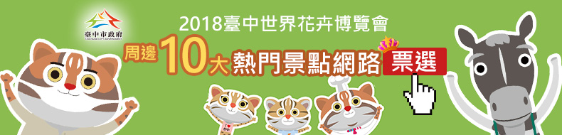 「2018臺中世界花卉博覽會」將於107年11月3日正式開幕,為了向來自世界各地的國外遊客,以及國內各縣市的國旅遊客行銷臺中在地人推薦之必遊十大景點,臺中市政府特別舉辦「2018臺中世界花卉博覽會周邊10大熱門景點」網路票選活動,邀請設籍於臺中市、年滿15歲(92年9月11日前出生)以上的市民,投票給心目中最不可錯過的花博順遊景點,參加者投票者還有機會獲得「花博吉祥物」鑰匙圈一個,歡迎市民踴躍參與。