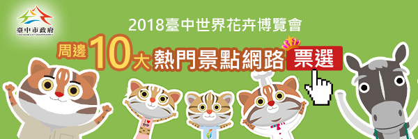 「2018台中世界花卉博覽會」將於107年11月3日開幕,共有三大展區,展期為期6個月。其中,「外埔園區」以農業休閒體驗及自然環境教育為主,「后里展區」則擁有歷史悠久的駿馬及鐵馬文化,而「豐原葫蘆墩公園」以「水岸花都」為主題結合地方漆器、林業及糕餅產業。觀旅局將積極宣傳本次網路票選活動前10名的景點作為花博順遊經典必玩景點,帶動園區周邊觀光人潮。