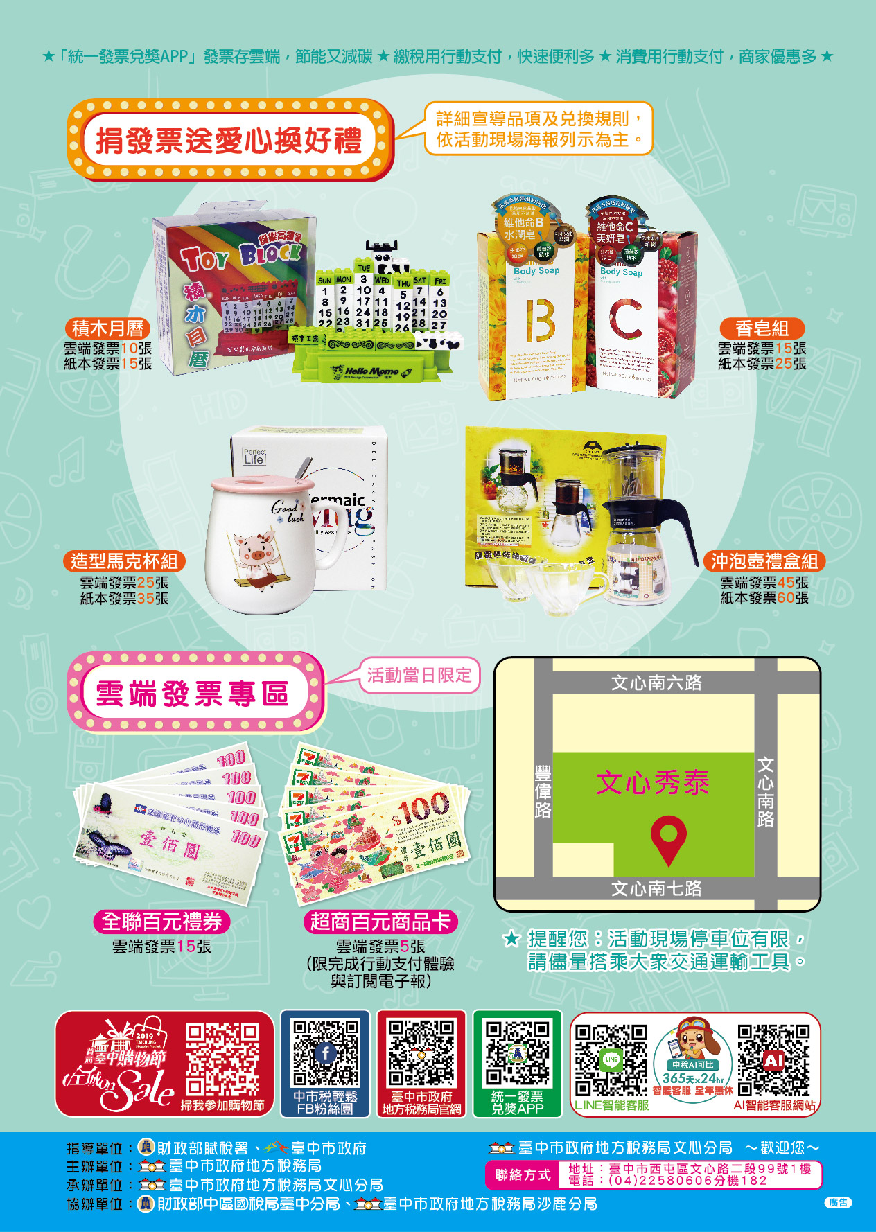 稅務局表示,這次租稅宣導活動將協助公益團體募集發票並行銷「2019首屆台中購物節」,凡於購物節期間到台中消費購物,累計滿500元就可上網登錄參加抽獎,週週抽好禮,週週送大獎,歡迎全國朋友共襄盛舉。相關活動訊息,可撥打電話04-22580606轉分機182洽詢,將有專人服務。台中購物節活動洽詢專線0800-668859或04-23831919。