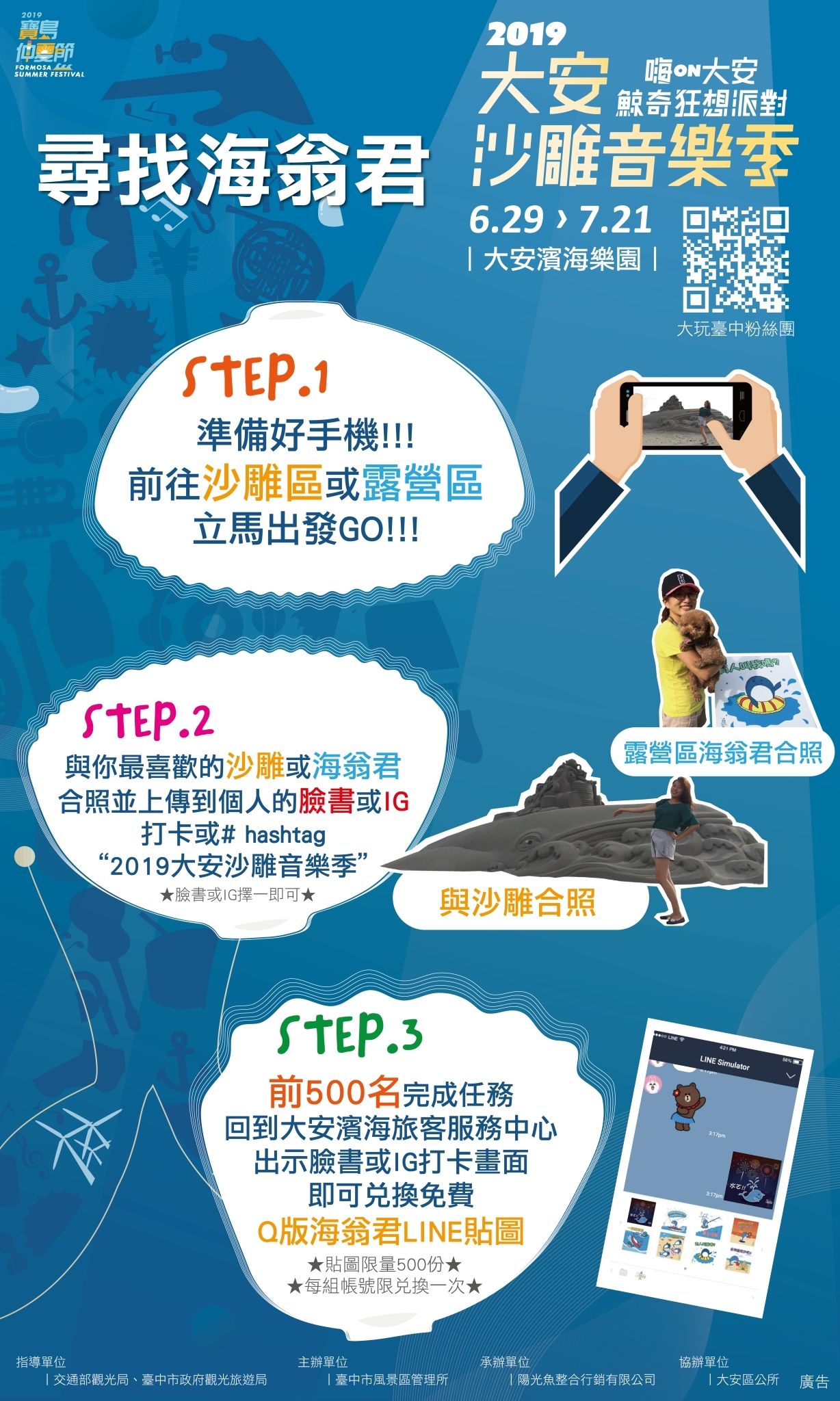 中台灣最大海洋盛事「2019大安沙雕音樂季」6月29日活動開幕至今,已吸引超過30萬人次,今年打造特大型海翁主雕(鯨魚頭及尾2座總長20米、寬6米、高3.5米)最吸睛,觀光旅遊局表示,明(13)日特別推出「尋找海翁君送LINE貼圖活動」,民眾只要與最喜歡沙雕或海翁君貼圖合照上傳到個人臉書或Instagram,並打卡或tag#大安沙雕音樂季,前500名完成任務的朋友即可免費兌換。