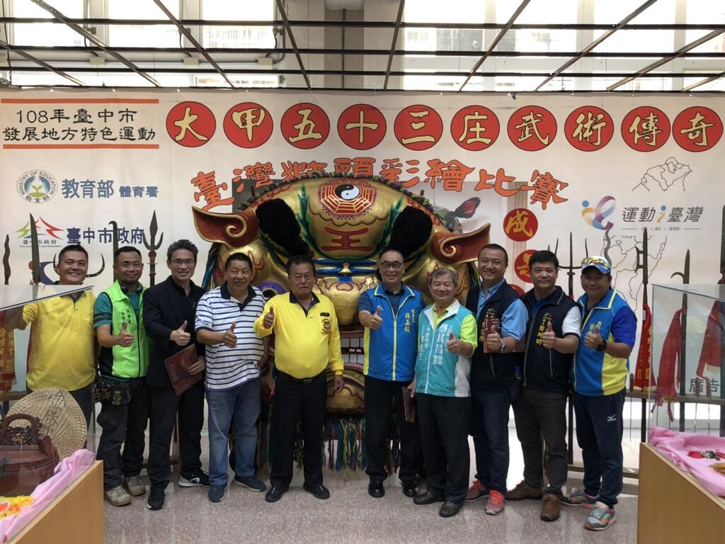 為宏揚台中傳統武術文化並展現全國僅有的大甲五十三庄傳統武術,台中市政府運動局與大甲區體育會合作,辦理大甲五十三庄傳統武術傳奇專案,其中「台灣獅頭彩繪比賽成果展覽」,即日起至8月30日在大甲區公所1樓展出,透過藝術彩繪讓民眾了解傳統武術文化價值,歡迎參觀。
