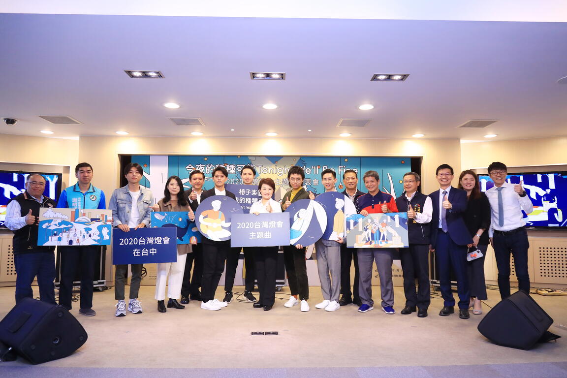 市府新聞局今日在台灣大道市政大樓舉行「2020台灣燈會主題曲」發表會,「椅子樂團」裘詠靖、陳仲穎及孫伯元3位年輕音樂人首次公開演唱,同時揭曉燈會主題曲MV,充滿童趣的動畫風格,融入台中地景及燈會展區,搭配輕柔歡快的節奏,市長盧秀燕也不禁跟著音樂一起點頭搖擺。