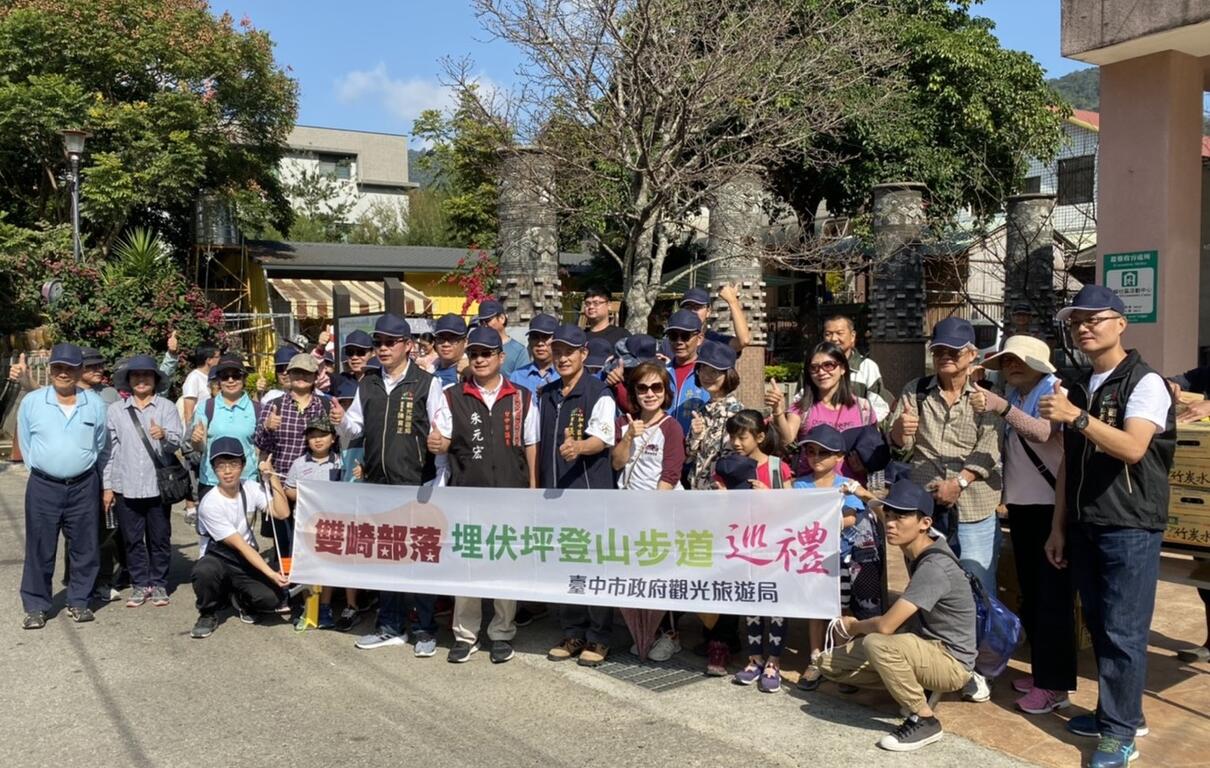 台中市府觀光旅遊局今(23)日在和平區雙崎部落921紀念公園舉行埋伏坪登山步道巡禮活動,首度由專業導覽人員帶領現場民眾,透過導覽解說方式,深度瞭解在地自然生態與人文歷史,參與遊客除了可一覽大安溪的秀麗景色外,前100名完成步道巡禮者,還可獲贈原住民文創苧麻紀念品、帽子等獎品,推廣雙崎部落秘境輕旅行。