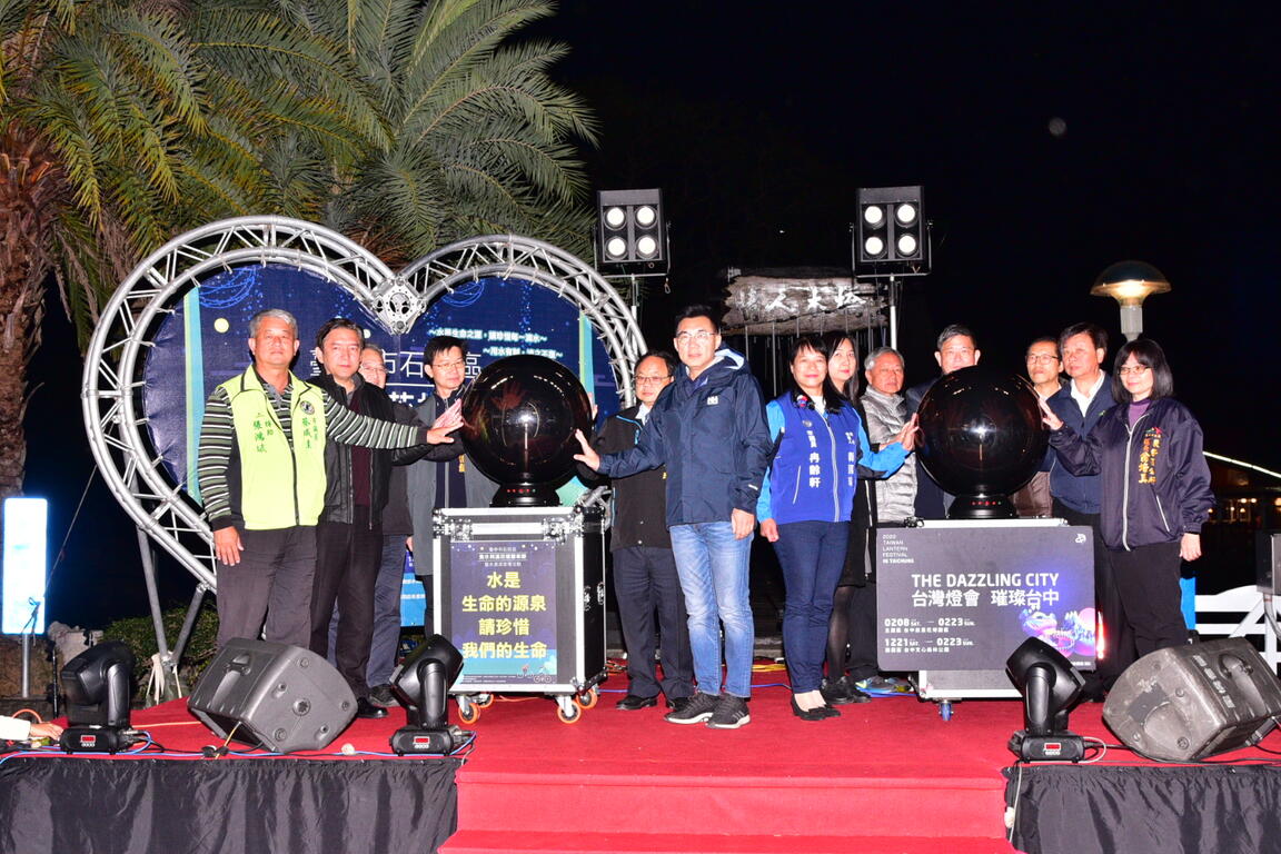 石岡區公所昨(7)日晚間在情人木橋舉辦點燈啟動儀式,吳局長、水利局長范世億、社會局長彭懷真、客家事務委員會主任委員江俊龍、立法委員江啟臣、市議員冉齡軒及經濟部水利署中區水資源局主任工程師劉松烈等人共同觸摸魔球宣布藝術節正式展開。