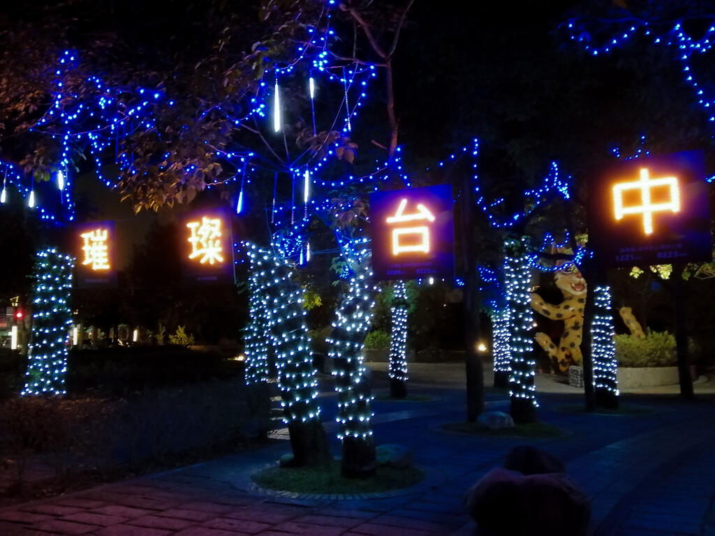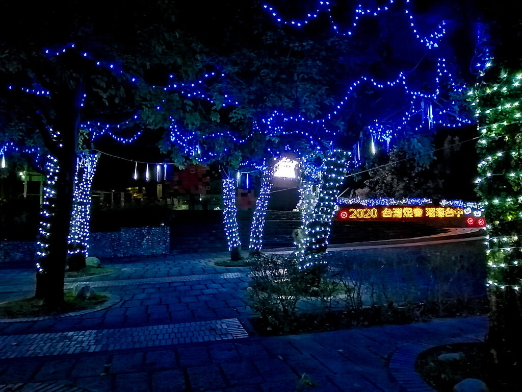文化局表示,屯藝中心的茄苳樹區、大門口旁植栽樹叢也設置藍、白色閃亮燈飾,增添節慶氛圍,吸引民眾駐足觀賞。