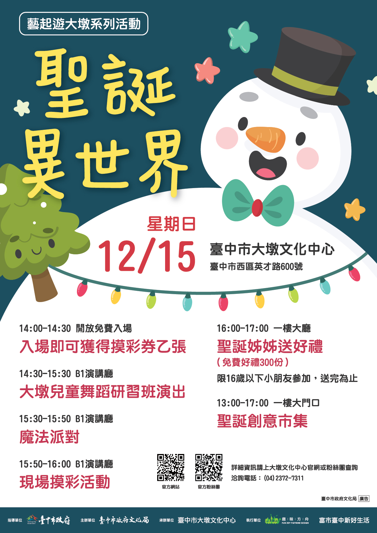 歡樂的時光總是過得特別快!本年度最後一場次的最後一場表演,將以大朋友小朋友都喜愛的魔法表演,搭配聖誕音樂,歡樂的聖誕節魔法Party正式展開!可愛的聖誕姐姐特別準備了300份禮物,要送給乖巧又可愛的小朋友們,想知道禮物是什麼嗎? 別忘了看完精彩的表演後,要到大廳來找可愛的聖誕姐姐,就能揭曉禮物的秘密囉~此外當天還有聖誕市集,會有乾燥花、巧克力等手作小物販售喔!
