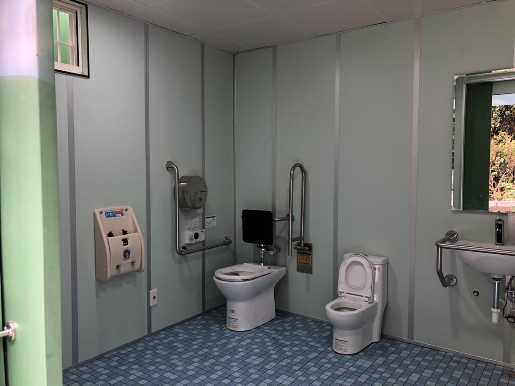 新建公廁建置內容包含男廁、女廁及無障礙兼親子廁所,並加強以往公廁通風不足及照明設備不良情形,也考量周邊步道屬親子級,貼心增設親子廁所;另公廁外牆融入地景特色,採當地生態特色的大冠鳩、紫斑蝶、台灣獼猴等浮雕與彩繪,有如身處於大坑秘境之中,打造一座以生態動物為主題的友善如廁環境。