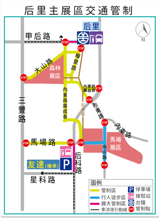 此外,主展區設有行人徒步區,禁止車輛進入(救護車輛除外),範圍包括馬場路(后科路-寺山路)與寺山路(營區-內東路),燈區及花馬道24小時管制,馬場路及寺山路管制時間則於平、假日下午2時至晚上12時,至於其它特定道路需憑證進入。