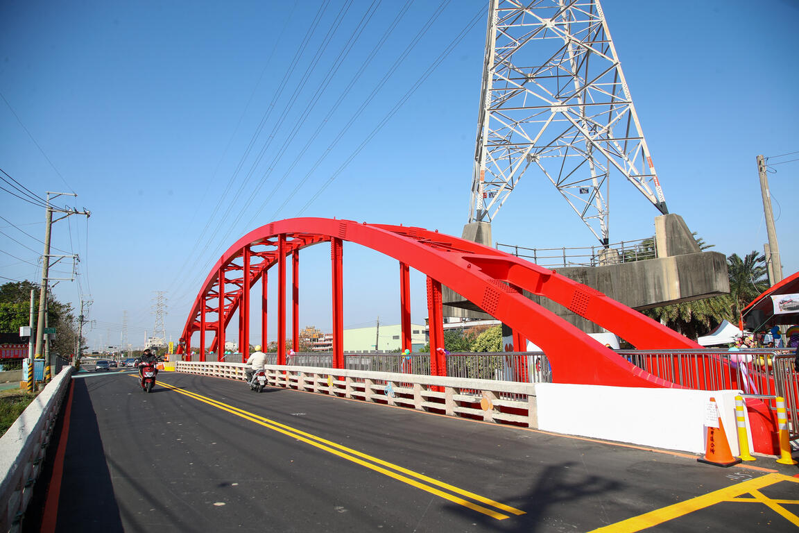 「龍井一號橋-人行鋼構橋」通行了!台中市龍井區觀光路為地方交通要塞,又是龍井國中學生上、下學必經道路,為保障市民及學生安全,市府建設局全額補助龍井區公所1000萬元,於原有橋面旁興建一座鋼構橋樑,歷經7個月施工,今(27)日開放通行,漆成紅色的橋面喜氣洋洋,成為龍井居民最好的新年禮物。