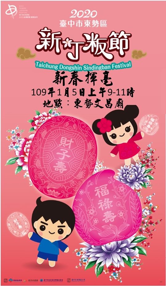 東勢區公所謹訂於109年1月5日上午9時起至11時止,假東勢文昌廟辦理「2020臺中東勢新丁粄節系列活動-新春揮毫」,將邀請東勢區知名書法老師現場揮毫送春聯,也有限量五福符贈送喔!