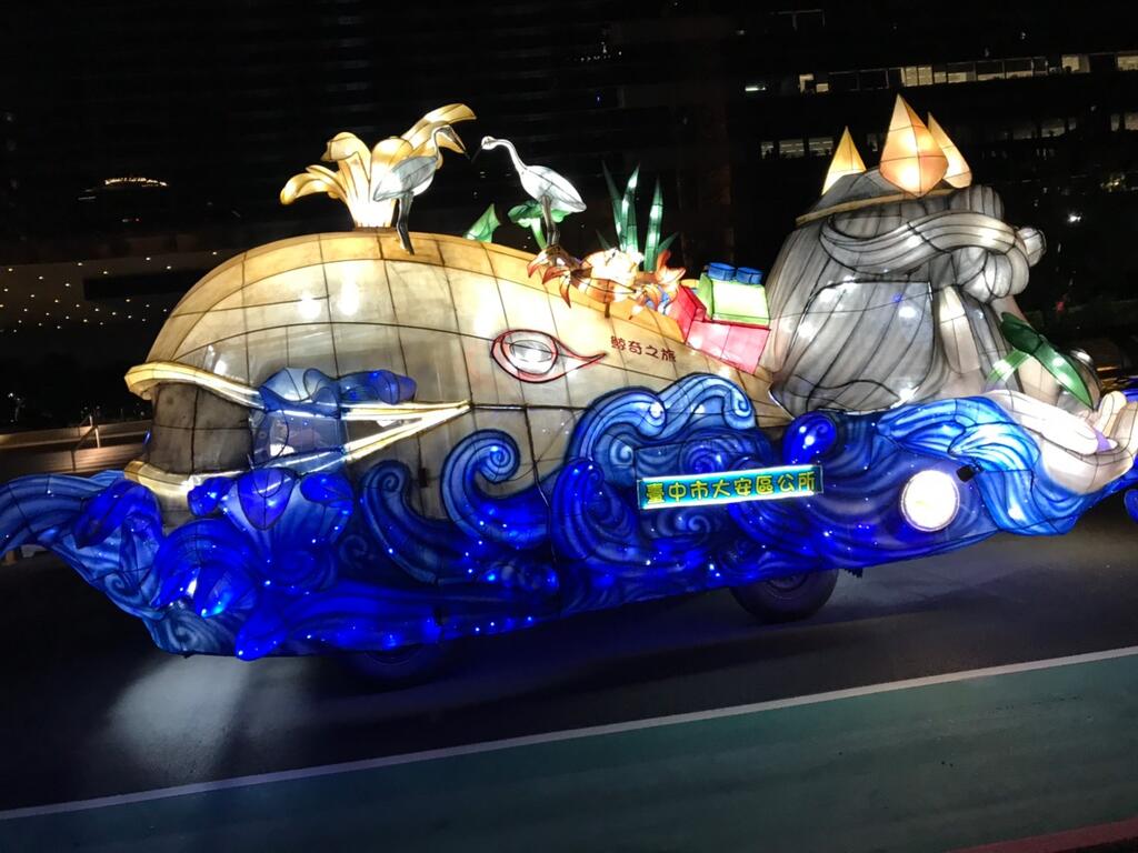 大安區花燈車以沙雕與大安濱海園區為主,利用鯨魚及海神意象呈現海洋生態,並搭配青葱、芋頭農特產品展現地方特色。大安區海岸線優美,並有河口生態特有動物,吸引許多民眾前來享受濱海風光。
