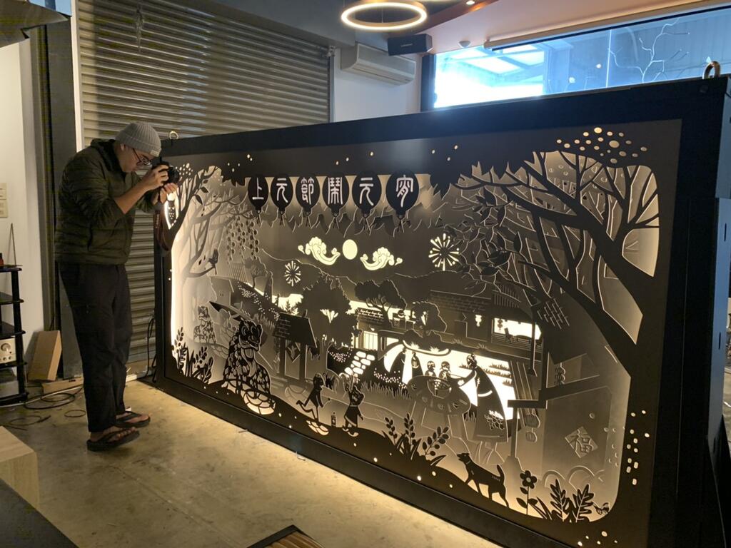 該作品主題為「上元節鬧元宵-大樹下的美好生活」,透過多層細緻雕刻的陽極處理鋁板,從背後及四周Led打光,營造出層次豐富、含義深遠的特色花燈,並融合了上元節(元宵節)鬧元宵、銀白月光灑在大地上、百年茄苳樹開花結果、貓頭鷹、五色鳥、螢火蟲、蝴蝶,以及村落院埕年節生活的舞獅、窯灶、拜年、吃湯圓等意象,歡迎民眾前往參觀。