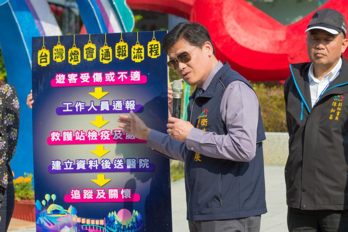 衛生局長曾梓展強調,燈會防疫四口訣「內外洗報」,密閉空間戴口罩、戶外口罩非必要、勤洗手多防護、有異狀速通報!因燈會多為戶外展區,健康民眾不強制戴口罩,只有「花舞館」屬於室內密閉空間,提醒民眾入內參觀配戴口罩。燈會期間遊客若有不適,工作人員會先帶至救護站,醫護人員進行檢疫處理並建檔資料,若需進一步診治,將由救護站協助民眾就醫,必要時將請消防局派遣救護車,將民眾後送至醫院,請民眾無須擔心。