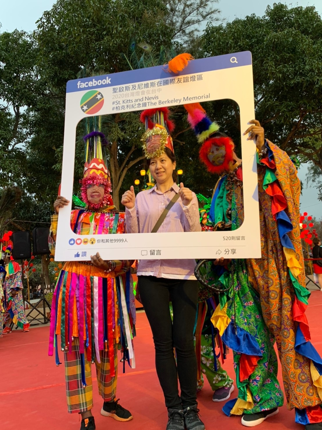 聖啟斯及尼維斯青年留學生應邀於2月15日在該國花燈前表演MASQUERADE舞蹈,也利用這個機會賞燈,他們表示很喜歡台灣,希望透過參與燈會讓大家更了解聖啟斯及尼維斯,以及加勒比海文化。