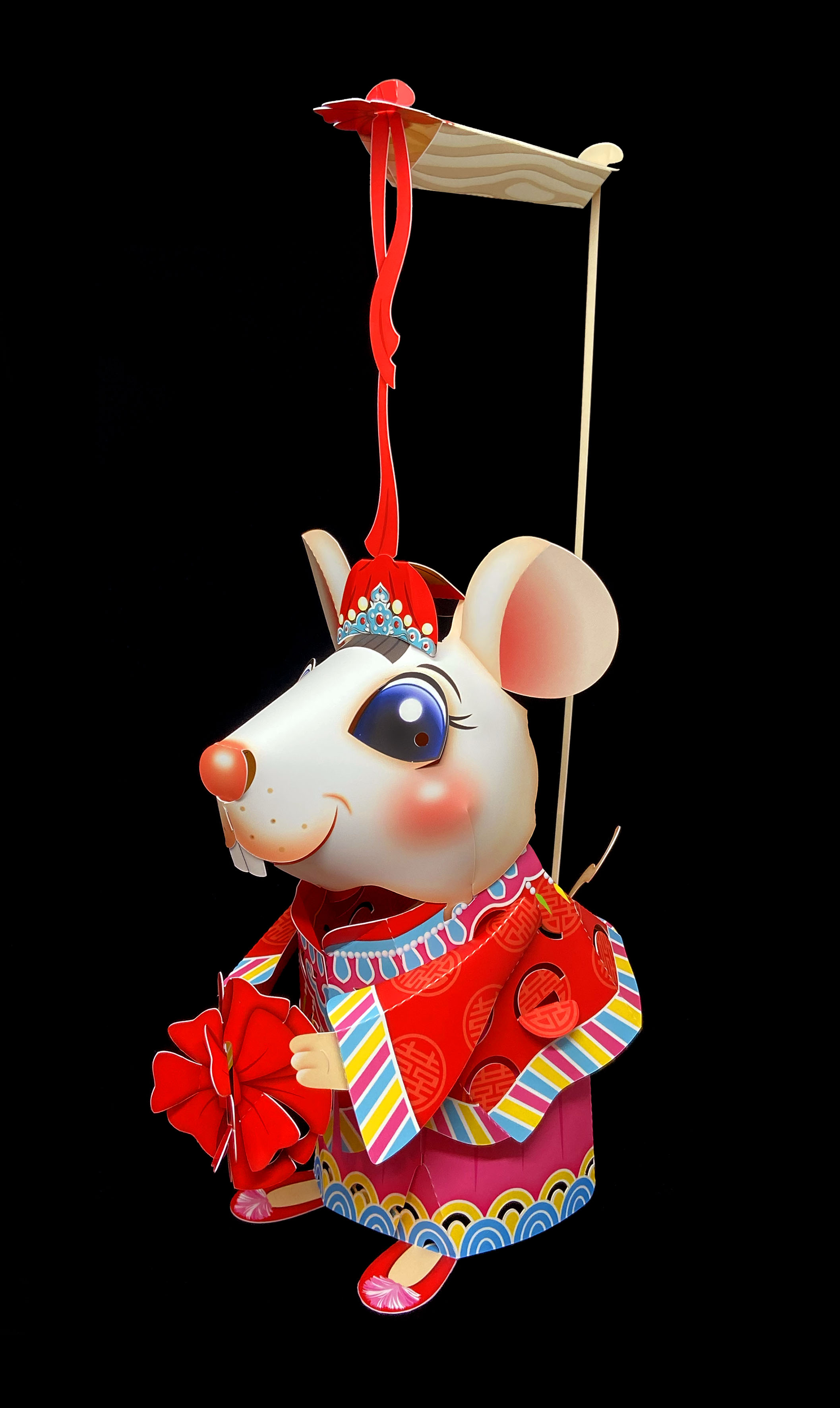 市府表示,今年鼠年小提燈以民間故事「老鼠娶親」為發想,創作出鼠新郎與鼠新娘2種不同造型的小提燈,只要上下擺動提把,2隻小老鼠就會彎腰鞠躬,互相拜年,也能當作手偶把玩,整體設計可愛又有趣。