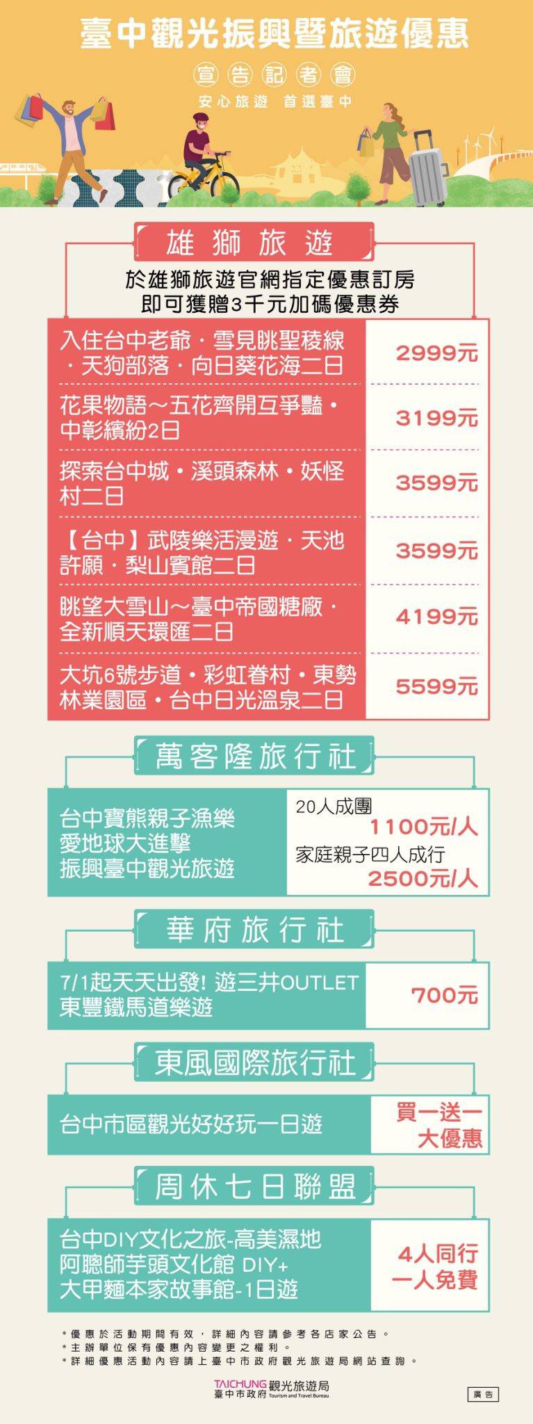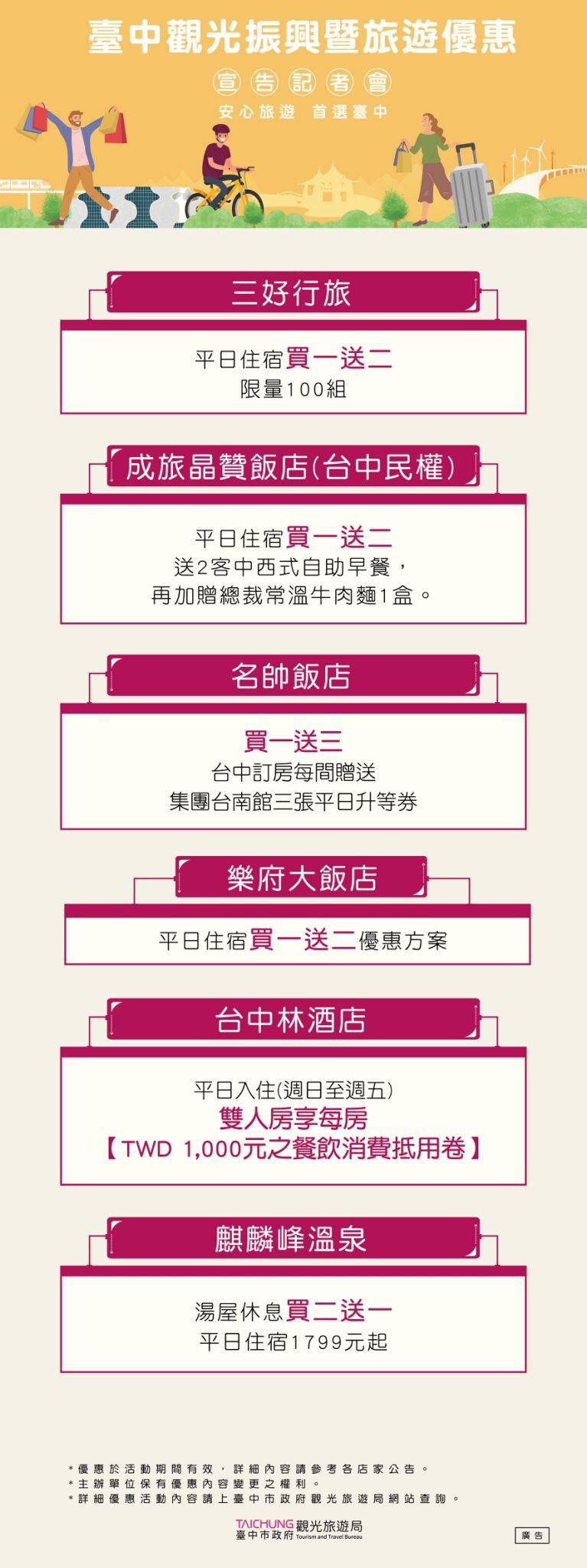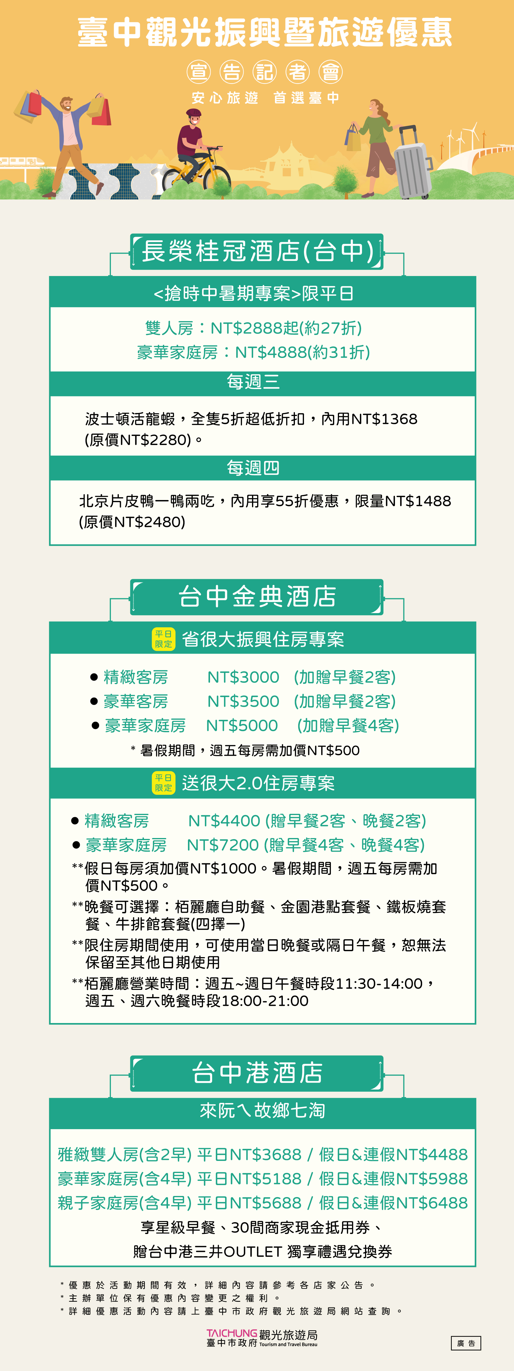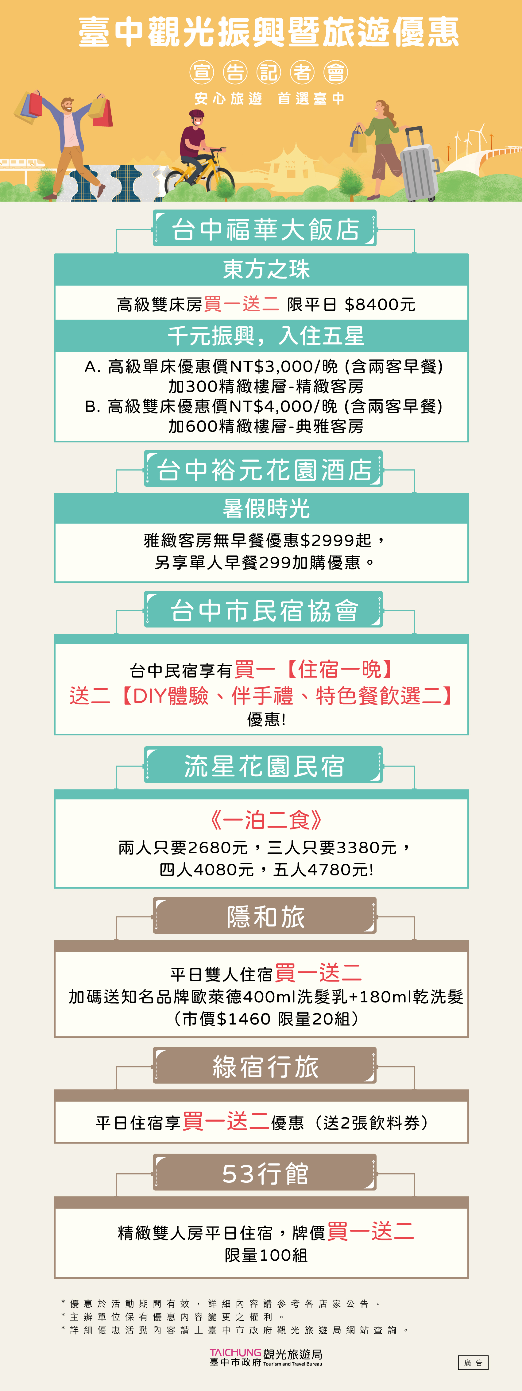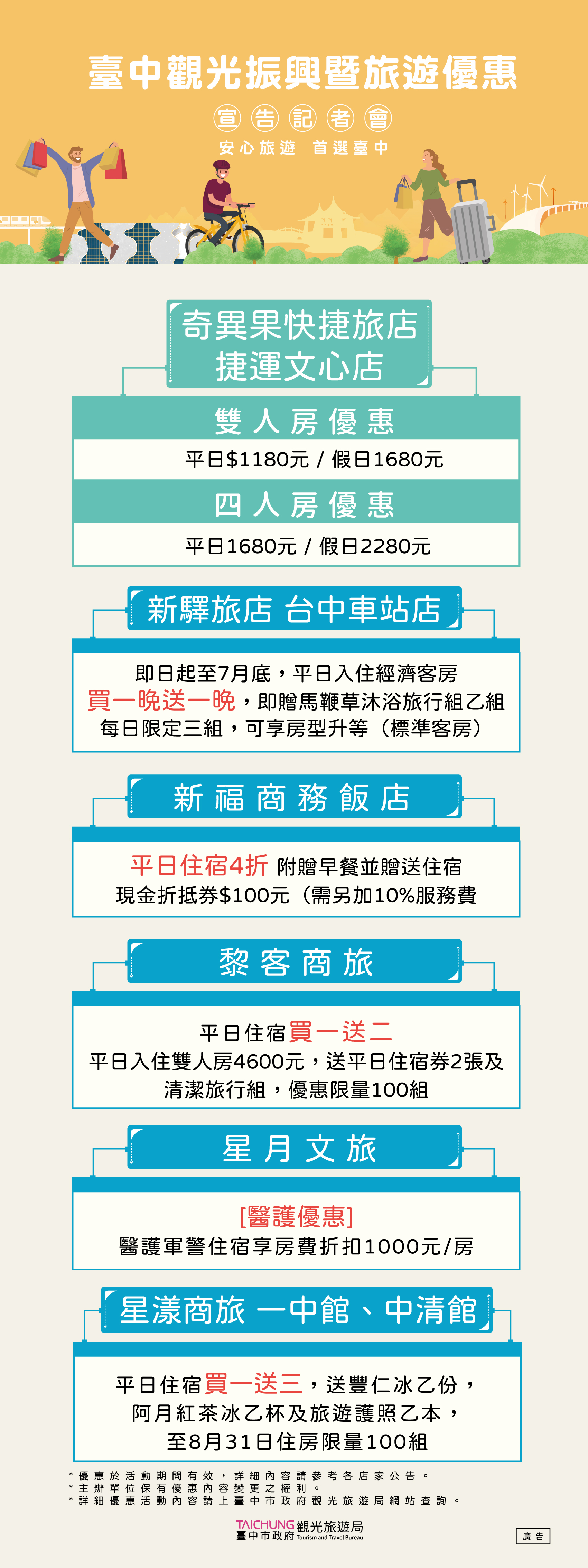 在臺灣新冠疫情逐漸趨緩後,臺中觀旅局積極整合臺中觀光相關各公協會、台灣國旅協會、台灣各大旅行社資源,在6/8強打第一波臺中國旅行銷優惠方案,彙集近百家觀光業者優惠方案,超過百條臺中及中台灣精選遊程;旅宿業買一送二或送三的下殺破盤,還加碼在地好禮、體驗優惠券與兌換券等;遊樂業部分水樂園第2人20元;超殺限時限量優惠通通在這裡,供大家及早規劃6月、端午連假與暑假的臺中國旅精彩假期。