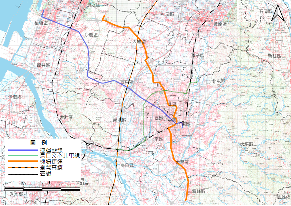 交通局表示,捷運綠線將在今年底通車、捷運藍線已辦理綜合規劃,另考量台中國際機場旅客往返市區的接駁需求,現正評估機場捷運橘線,從地區發展潛力、運輸系統特性、道路系統條件,提出橘線建設方案,規劃路線從台中國際機場,行經大雅市區、水湳經貿園區、一中商圈、台中火車站、中興大學、台中軟體園區,終點設在省議會紀念園區附近,全長約29.2公里,共設26座車站。其中,水湳轉運中心至中興大學間共為11座地下車站,其他15座則為高架車站。