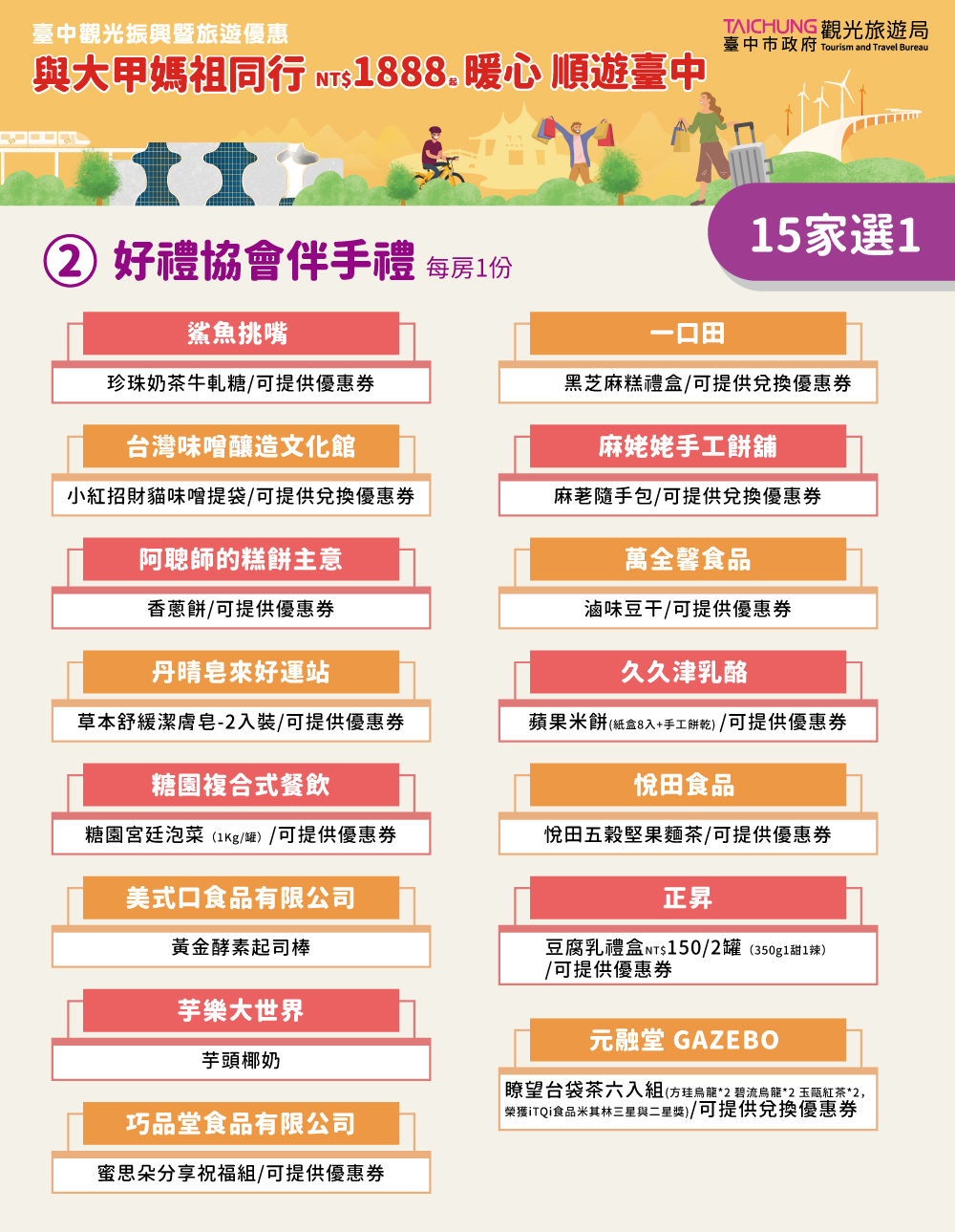 林局長指出,配合不同客群需求,「香客專案」囊括了日月千禧、裕元花園、金典酒店、台中長榮、台中福華、全國飯店、台中GOGO回行旅、草悟道酒店、星動銀河旅站、大甲茂華商務旅館、豐原川賦商務旅館HOTEL等11家星級飯店及親民旅館。贈送的伴手禮極具台中在地特色,包括鯊魚挑嘴-珍珠奶茶牛軋糖、台灣味噌釀造文化館-小紅招財貓味噌提袋、一口田-黑芝麻糕禮盒、麻姥姥手工餅舖-麻荖隨手包、元融GAZEBO-瞭望台袋茶六入組、阿聰師的糕餅主意-香蔥餅、萬全馨食品-滷味豆干、丹晴皂來好運站-草本舒緩潔膚皂、久久津乳酪-蘋果米餅、糖園複合式餐飲-宮廷泡菜、悅田食品五榖堅果麵茶、正昇-豆腐乳禮盒、美式口食品有限公司-黃金酵素起司棒、巧品堂食品有限公司-蜜思朵分享祝福組、芋樂大世界-芋頭椰奶,種類多元,更不乏榮獲台中十大伴手殊榮的伴手好禮!