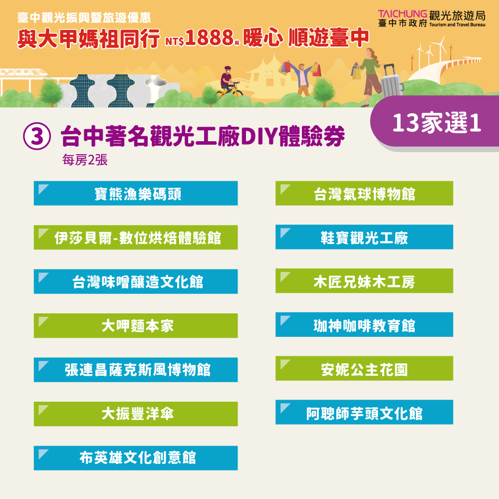 此外,觀光工廠體驗套券從木匠兄妹木工房、張連昌薩克斯風博物館、大呷麵本家、台灣味噌釀造文化館、寶熊漁樂碼頭、大振豐洋傘、布英雄文化創意館、台灣氣球博物館、鞋寶觀光工廠、珈神咖啡教育館、安妮公主花園,到適合親子同遊的阿聰師芋頭文化館及伊莎貝爾-數位烘焙體驗館,選擇豐富,更引人注目的是,15家伴手禮及13家觀光工廠體驗券任你自由配,保證玩得開心、吃得滿意!