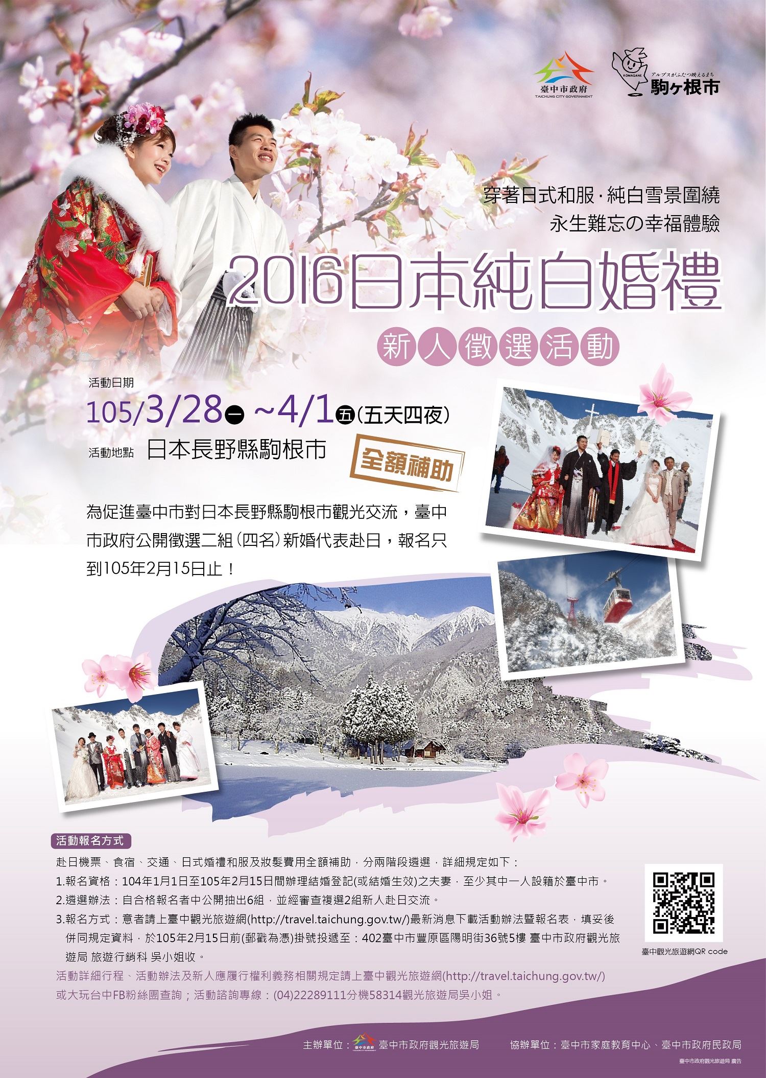 為促進臺中市對日本長野縣駒根市觀光交流,臺中市政府公開徵選二組(四名)新婚代表赴日,報名只到105年2月15日止!
