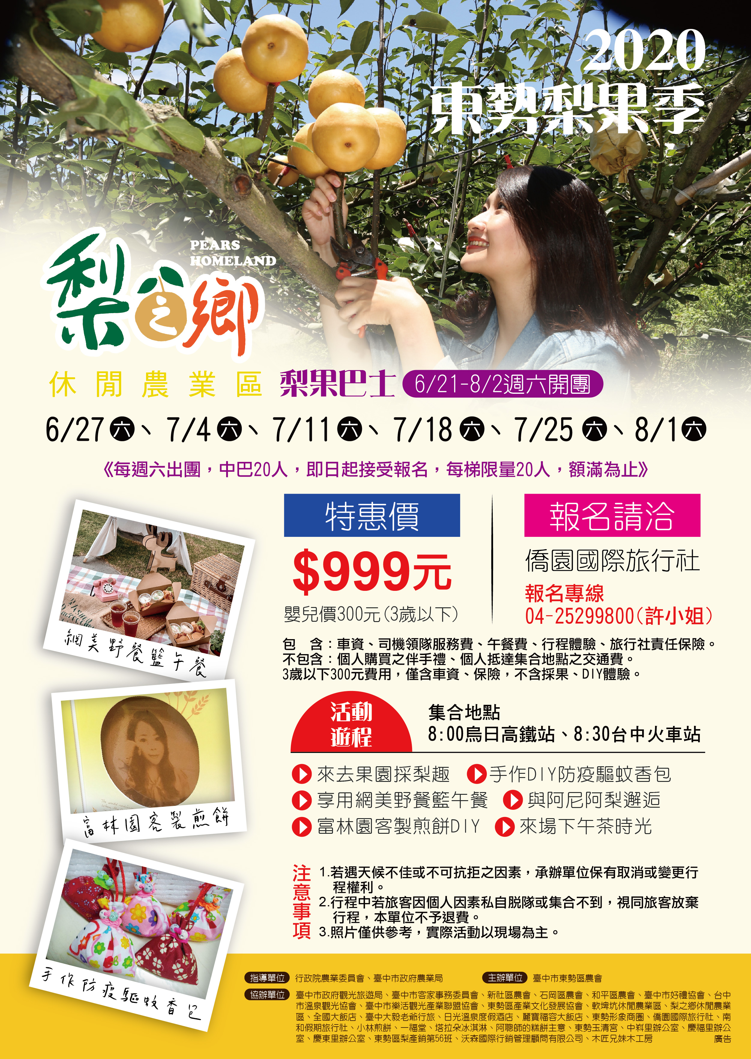 此外,「2020東勢梨果季系列活動」自6月21日至8月2日,推出採果巴士、果樹認養、及阿尼斯特地景藝術佈置等一系列體驗農樂活動;今年更特別與台中大毅老爺行旅ZEBRA餐廳與策展團隊,跨域合作辦理「梨不開的美味盛宴」,將在地當季農產入菜,打造美味與旅遊體驗,歡迎於台中購物節期間,來趟仲夏農遊輕旅行。