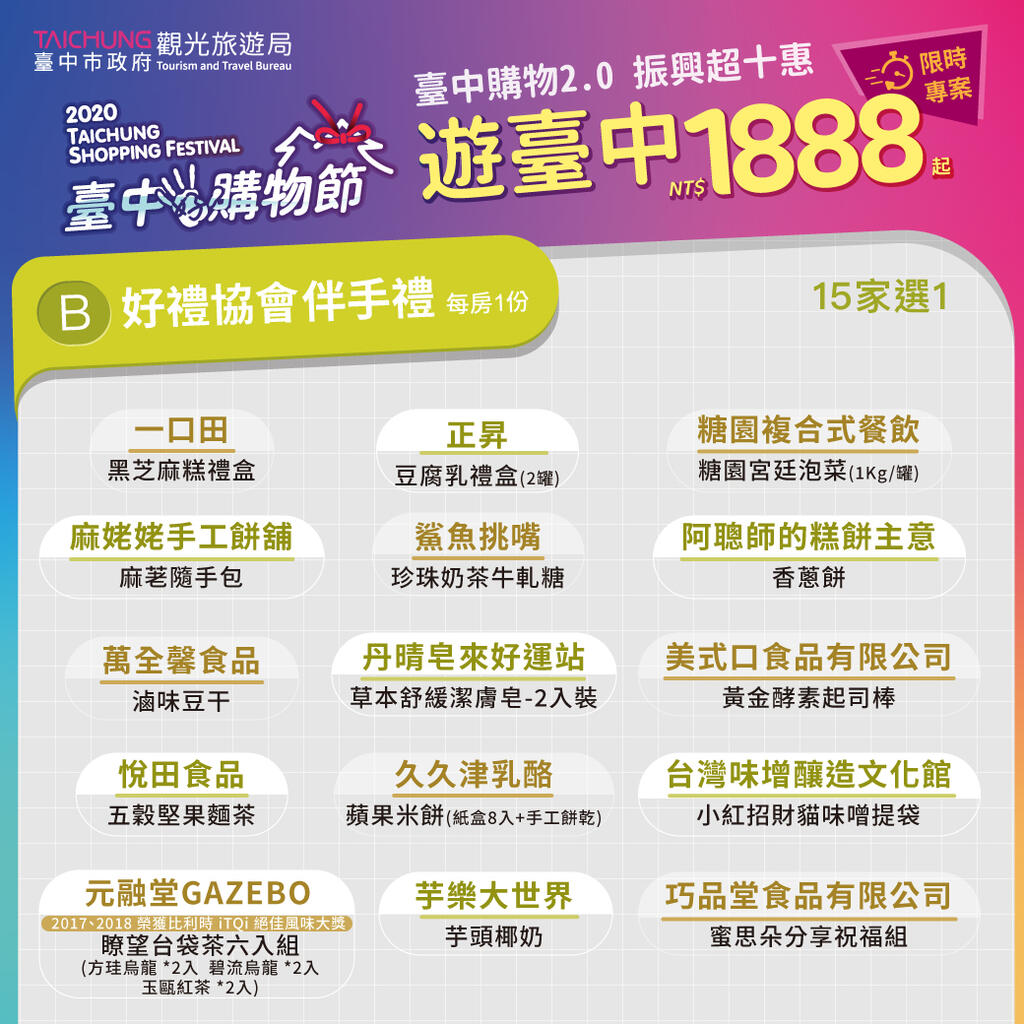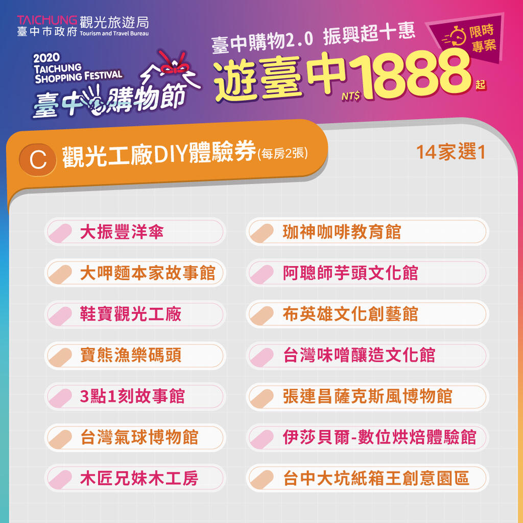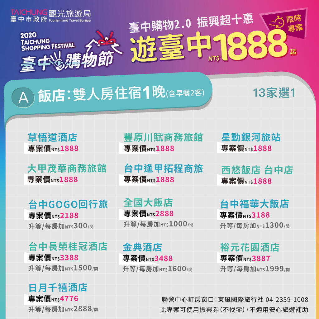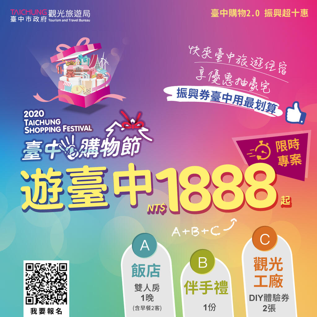 觀旅局特別邀集台中市旅館商業同業公會、觀光旅館商業同業公會、產業故事館發展協會及好禮協會等業者共同推出限時限量優惠,「1888一路發發發」超值套裝遊程,即可享有雙人房1晚、早餐2客、在地伴手禮一份、觀光工廠DIY體驗券2張。來台中振興消費,三倍券十倍奉還,好玩又實惠! 超值優惠專線04-2359-1008 相關照片