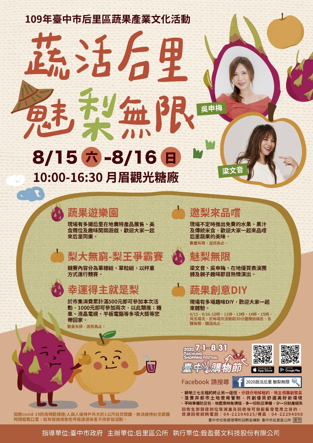 后里區蔬果產業文化活動訂於109年8月15日至16日假后里月眉觀光糖廠舉辦,活動有高接梨趣味競賽、紅龍果展示、蔬果創意DIY、免費水果、飲品、傳統米食品嚐,幸運得主就是梨等,節目精彩豐富,歡迎大家共襄盛舉。