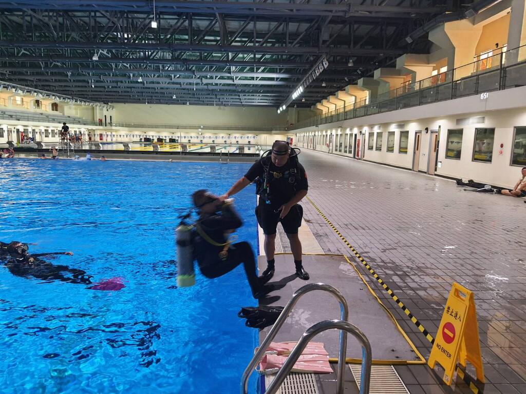 運動局說明,活動結合在地的潛水訓練中心,今日教學由具有潛水教練訓練官證照的鄒教練擔任老師,帶領學員練習「重裝跨步式入水」、「重裝下潛」、「耳壓平衡」等重要技能,完成課程即頒發「結訓證書」,鼓勵大家透過活動了解基礎潛水觀念,潛入蔚藍水中體驗樂趣,學會愛護生態及永續海洋生命。
