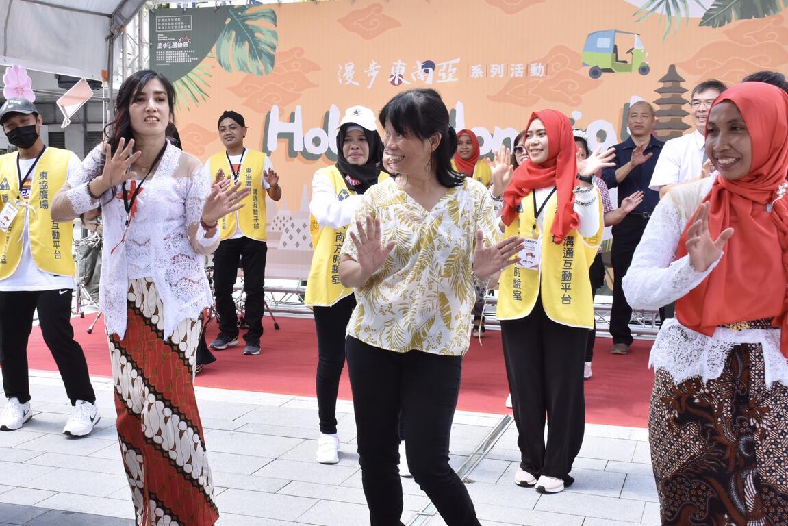 今日活動由靜宜大學、台中市喜樂文化推廣協會協辦,一早活動由印尼舞蹈揭開序幕。張局長與在場民眾同樂,現場即興演奏源自印尼的知名歌謠「甜蜜蜜」,讓印尼移工、僑生、新住民身在異鄉也能感受家鄉的慶典氣氛,同時讓無法出國民眾一起享受異國歡樂氛圍。參與民眾不但可欣賞特色表演,也可穿著印尼傳統服飾、佩帶飾品感受印尼文化,與三五好友遊市集買曼煎粿、黃豆餅、薑黃飲料,享受印尼風味的點心;另有台中在地丸文食品、阿奇師等美食。下午則接續辦理印尼國慶傳統趣味遊戲「吃蝦餅挑戰賽」、「拔河對抗賽」、「木屐合力賽」、「布袋跳跳腳力賽」及「頂頭立地平衡賽」,熱鬧滾滾。
