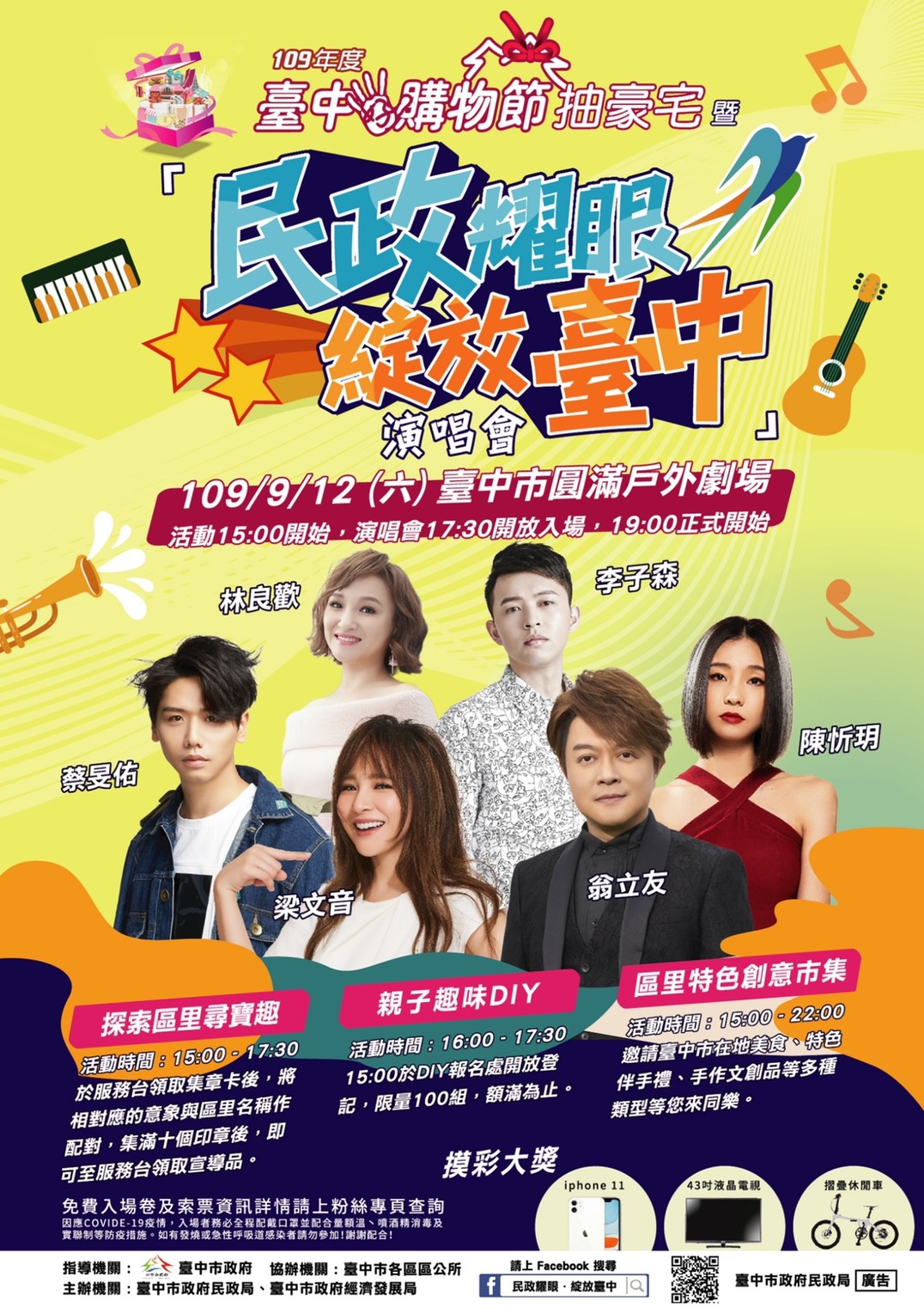 今(28)日舉行演唱會系列活動宣傳記者會,由來自台中的超偶冠軍李子森帶來精采演出為活動宣傳,市府民政局表示,演唱會當天卡司堅強,除金曲歌王翁立友、梁文音、李子森、陳忻玥、蔡旻佑、及林良歡等人輪番開唱,現場還有區里特色市集、親子趣味DIY等精彩活動,以及iPhone11、43吋液晶電視等大獎摸彩。