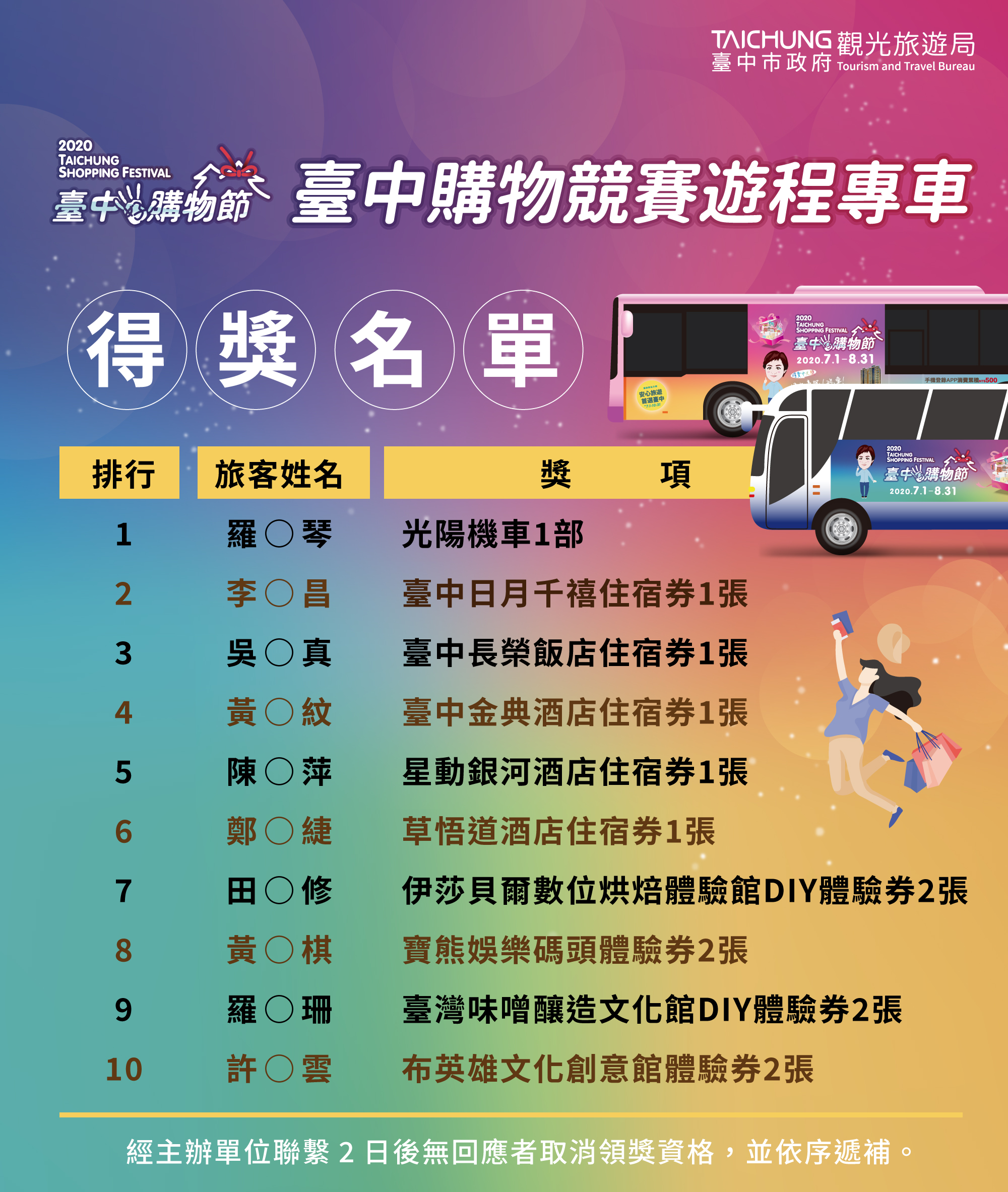 臺中購物競賽遊程活動專車獲獎名單公布!