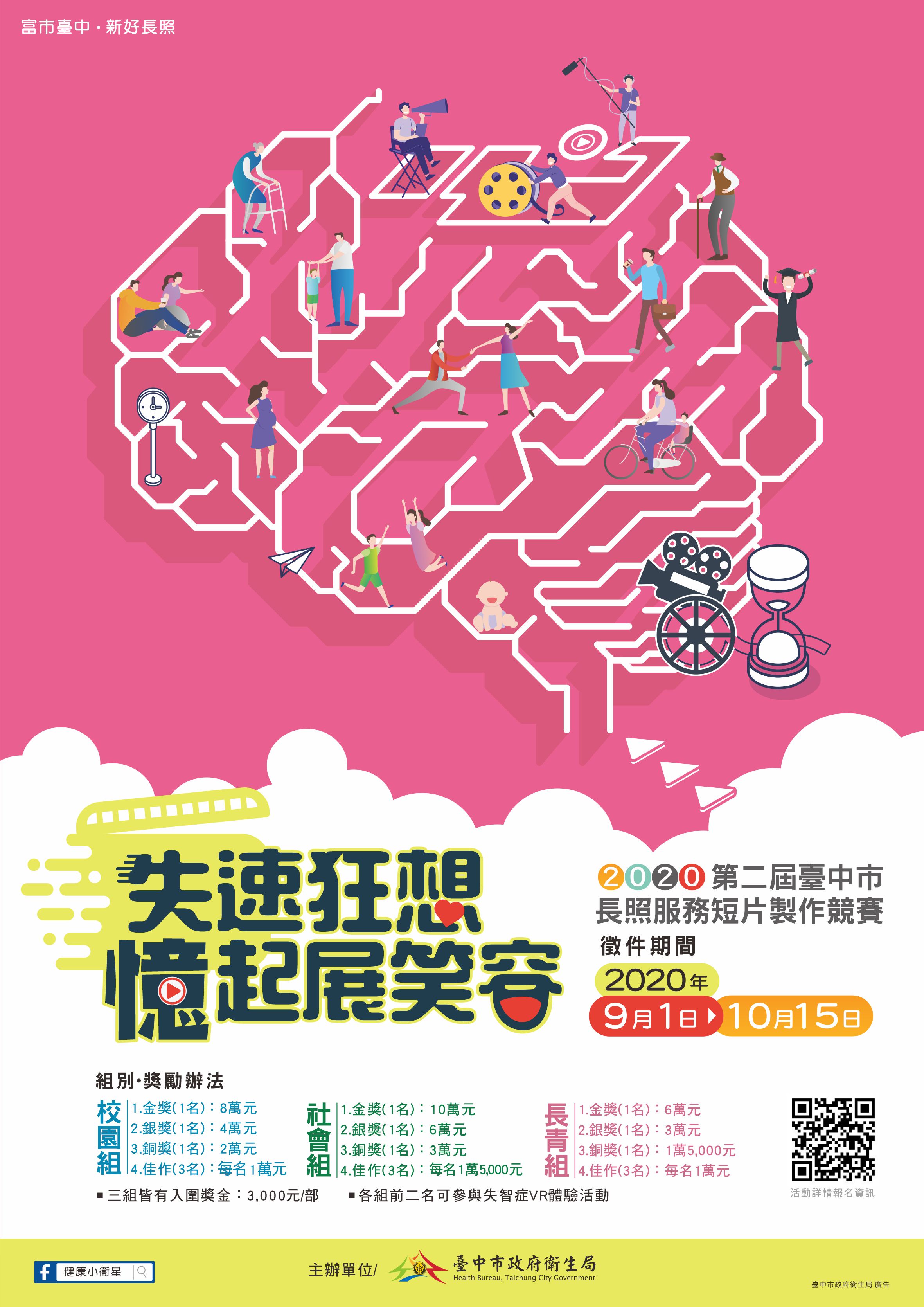 共同營造失智友善支持環境,台中市政府衛生局舉行第2屆長照服務短片製作競賽「失速狂想 憶起展笑容」,以打造高齡友善健康幸福城市為主題,鼓勵拍攝創意影片,宣導失智症與長照服務相關資訊,並喚起社會大眾對失智症議題的關注,徵件自即日起至10月15日止,最高獎金10萬元,歡迎對影像創作或相關興趣有熱忱者前來挑戰。